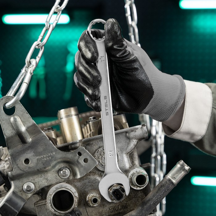 Набор Stels 15428 включает 8 комбинированных ключей из стали CrV, размером от 8 до 19 мм, покрытых матовым хромом, и используется для закручивания и откручивания гаечных и болтовых соединений. Накидная головка каждого кл...