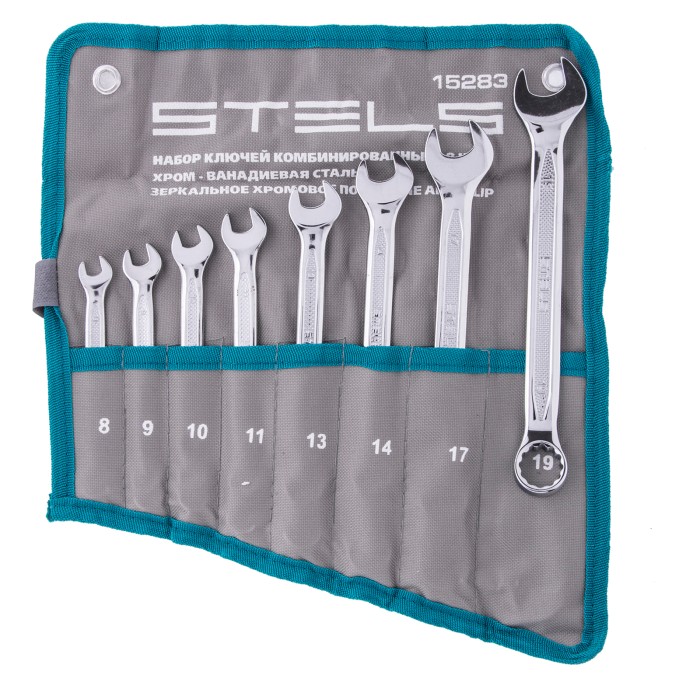 Набор Stels 15283 включает 8 комбинированных ключей из стали CrV, размером от 8 до 19 мм, антислип, которые позволяют откручивать и закручивать резьбовые соединения. Они универсальны в применении, т.к. имеют кольцевую и рожковую головки. 12-гранный профиль накидного зева обеспечивает увеличенную площадь контакта с поверхностью крепежа, что минимизирует вероятность его деформации. Ключи будут полезны в автомастерской, для монтажа и демонтажа оборудования, пригодятся для работ по дому.ПреимуществаВысокий показатель прочности — инструменты изготовлены из стали хромованадиевой группы, твердость рабочих частей составляет 42-50 HRC.Улучшенные антикоррозионные свойства и повышенная износостойкость благодаря хромированному покрытию.Удобство при выполнении монтажных работ — кольцевой зев каждого ключа смещен на 15 градусов относительно его тела.Надежный хват — благодаря рельефной поверхности ключи не скользят в руке.