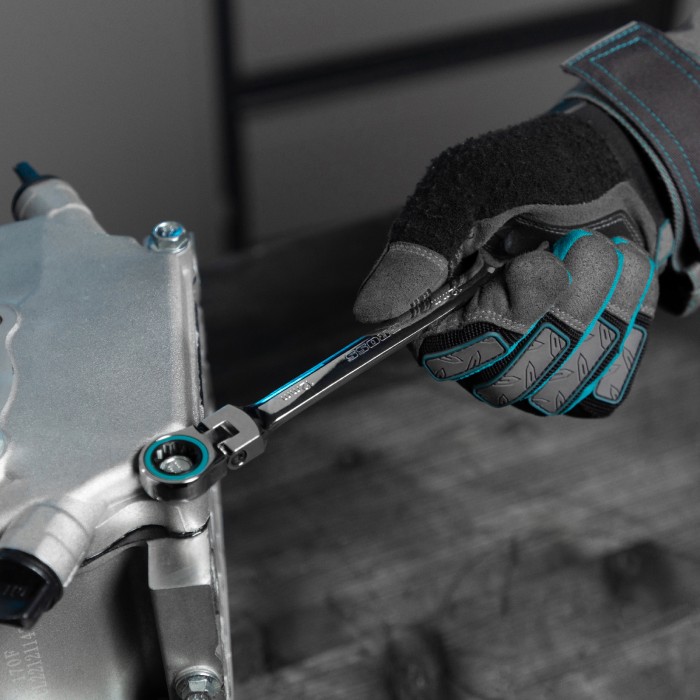 Набор шарнирных комбинированных ключей с трещоткой Gross 14891 включает в себя 7 предметов из стали CrV для откручивания и закручивания резьбовых соединений с диаметром головки 8-19 мм. Благодаря наличию рожкового зева ключи подходят для любых типов крепежей. 12-гранная кольцевая головка обеспечивает надежный контакт с поверхностью болта или гайки, облегчая работу и уменьшая риск деформации граней крепежа. Набор используется для обслуживания и ремонта автомобилей, пригодится также и в быту.ПреимуществаПрочность — ключи изготовлены из высокотвердой хромованадиевой стали.Высокий ресурс — храповой механизм твердостью 58 HRC долго сохраняет рабочие качества.Долговечность — хромоникелевое покрытие защищает инструменты от коррозии.Работа с крепежами в разных плоскостях — накидные головки с шарнирным механизмом изменяют свое положение на 180 градусов по вертикали.Удобная работа даже в труднодоступных местах — трещоточный механизм с 72 зубцами обеспечивает плавный и быстрый монтаж резьбовых соединений (угол поворота трещотки всего 5 градусов).