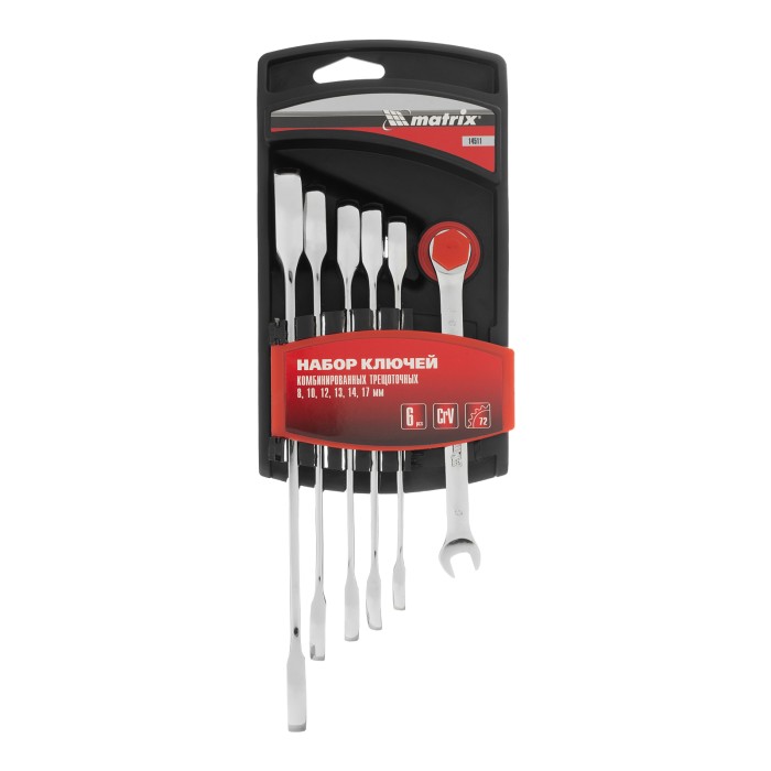 Набор из 6 комбинированных трещоточных ключей Matrix 14511 пригодится мастерам и автолюбителям для монтажа/демонтажа болтов и гаек наиболее популярных типоразмеров. Храповой механизм с 72 зубьями облегчает закручивание или откручивание крепежей, в том числе в труднодоступных местах.ПреимуществаНадежность — ключи выполнены из хромованадиевой стали повышенной прочности, твердость храпового механизма составляет 58 HRC.Защита от разрушения — хромоникелевое антикоррозионное покрытие предохраняет инструменты от воздействия влаги.Эффективная работа — 12-гранный профиль накидной части ключа плотно охватывает поверхность крепежа, предотвращая деформацию его граней.Удобство хранения и транспортировки — набор упакован в пластиковый держатель.