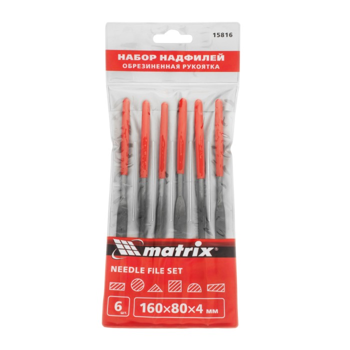 Набор Matrix 15816 из 6 надфилей размером 160 х 4 мм, с обрезиненными рукоятками, предназначен для опиливания поверхностей из древесины, стекла, керамики и других материалов. Надфили с разными профилями позволяют обрабатывать пазы, отверстия, детали с округлыми и рельефными поверхностями. Инструменты необходимы в слесарной, столярной мастерской, пригодятся для занятий моделированием.ПреимуществаПрочность и долговечность — надфили изготовлены из конструкционной стали.Высокое качество обработки — на полотно каждого надфиля нанесена двойная перекрестная насечка.Быстрый поиск среди других инструментов — рукоятки красного цвета хорошо заметны.Комфортная работа — обрезиненные рукоятки не выскальзывают из рук.Удобное хранение и транспортировка — набор упакован в прозрачный чехол.