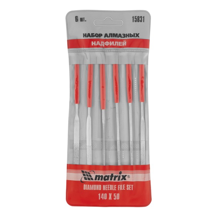 Набор алмазных надфилей Matrix 15831 размером 140 х 50 х 3 мм предназначен для выполнения точных работ и используется для доводки и зачистки мелких деталей. Подходит для обработки металлических, стеклянных, керамических поверхностей. Набор универсален, т. к. в него входят 6 надфилей с разными сечениями профилей, что позволяет опиливать ровные поверхности, а также углы, пазы, отверстия и округлые выступы. Надфили пригодятся в слесарном деле, при занятиях моделированием, будут полезны и в быту.ПреимуществаТвердость и износостойкость — инструменты изготовлены из высокоуглеродистой стали.Высокие абразивные свойства — на рабочие части нанесено напыление из алмазной крошки.Комфортная работа — обрезиненные рукоятки не выскальзывают из ладони.Быстрый поиск инструментов — красный цвет рукояток хорошо заметен в рабочем пространстве.
