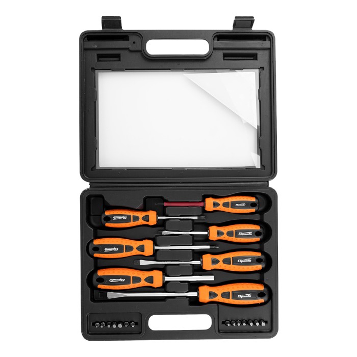 Пластиковый кейс - 1 штОтвертки: РН1х75 мм, РН2х100, SL3х75, SL5x75, SL6x100, SL8x150 - 6 штБиты 25 мм: Н2, Н3, Н4, Н5, Н6, Т10, Т15, Т20, Т25, Т27, Т30, Т35, Т40 - 13 шт