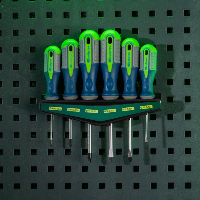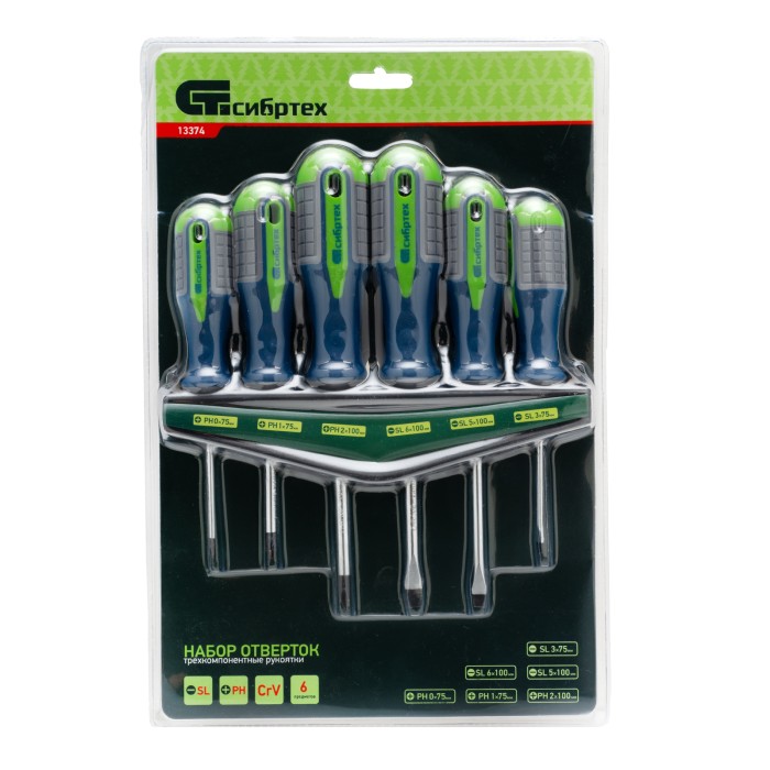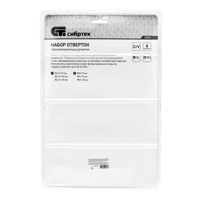 Набор отверток Сибртех 13374 включает в себя 6 предметов из стали CrV с трехкомпонентными рукоятками, которые будут полезны мастерам при осуществлении несложных ремонтных и монтажных работ. С их помощью можно производить монтаж/демонтаж резьбового крепежа с профилем SL и PH. Длина стержней отверток составляет 75-100 мм для удобства работы с крепежом на поверхностях и в небольших углублениях.ПреимуществаДолговечность и надежность — стержни выполнены из прочной хромованадиевой стали, рабочие части закалены до твердости 50-52 HRC.Антикоррозионная стойкость — металлические части имеют хромовое покрытие, а кончики отверток фосфатированы.Универсальность — набор включает отвертки самых распространенных размеров: PH0, PH1, PH2, SL3, SL5, SL6.Компактное хранение — набор поставляется на подвесной пластиковой полке, а рукоятки имеют специальные отверстия.