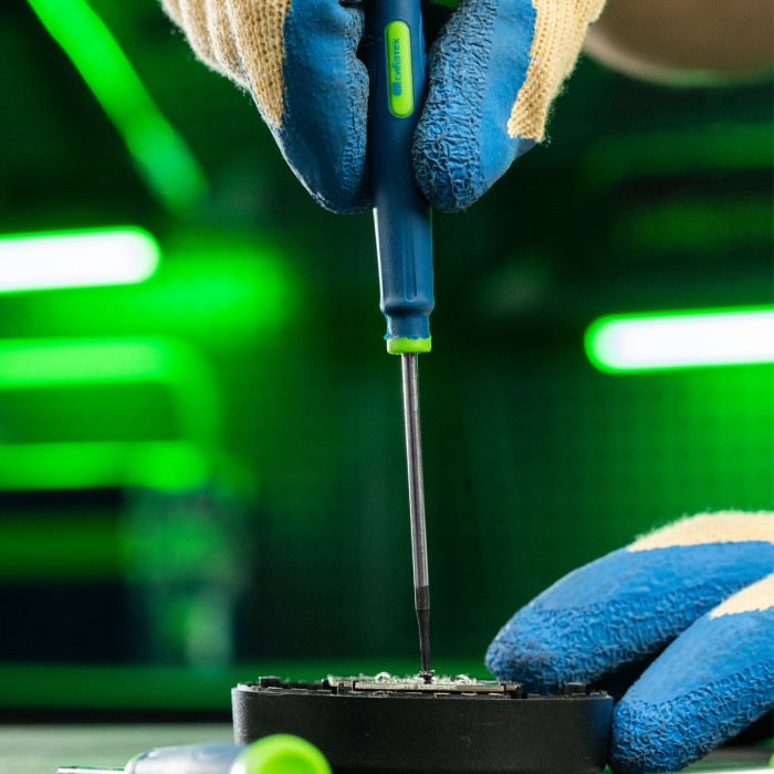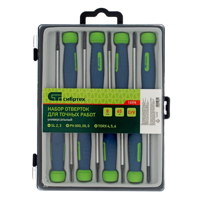 Универсальный набор отверток Сибртех 13378 включает 8 инструментов из стали CrV и рассчитан на полупрофессиональное использование при проведении точных работ. Отвертками можно закручивать и откручивать микровинты типа SL, PH и TORX, поэтому они пригодятся для ремонта мелкой бытовой техники, электроники, детских игрушек и других устройств.ПреимуществаВысокое качество исполнения — стержни отверток изготовлены из прочной хромованадиевой стали.Удобная работа — поворотные затыльники позволяют быстро вращать отвертки перебором пальцев.Эргономичность — двухкомпонентные рукоятки удобно лежат в руке.Продуманное хранение и транспортировка — набор упакован в пластиковый бокс с подвесом.