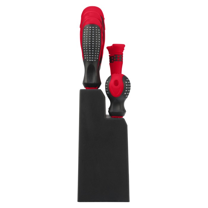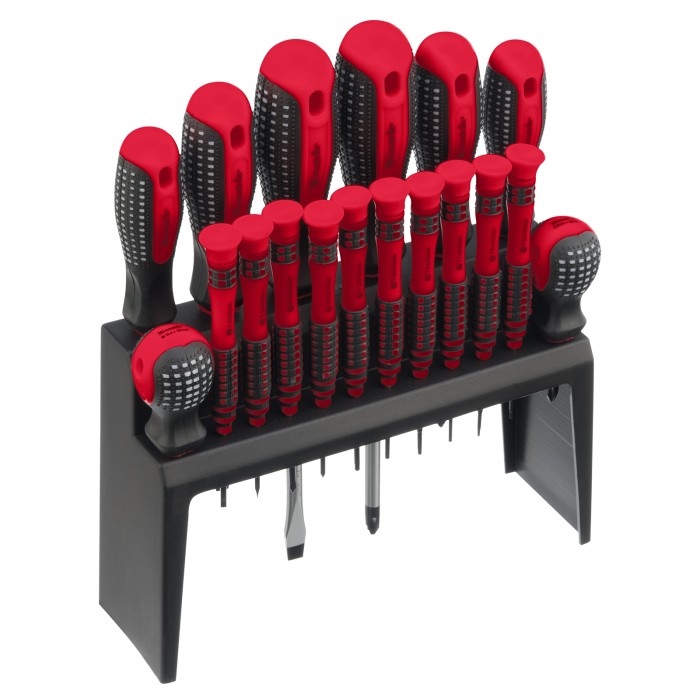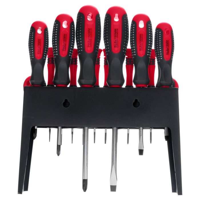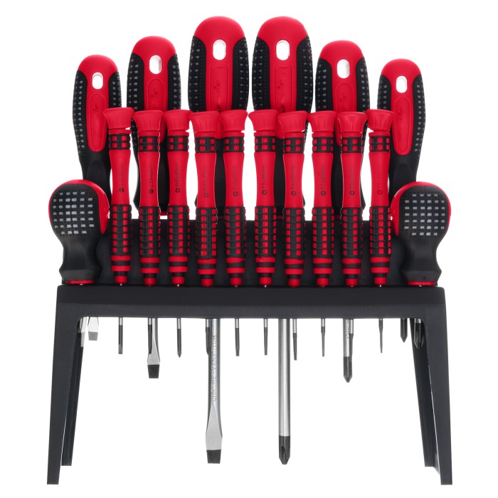 Отвертки стандартные: РН1х75 мм, РН2х38 мм, РН2х100 мм, РН3х150 мм, SL5x75 мм, SL6x38 мм, SL6x100 мм, SL8x150 мм - 8 штОтвертки для точных работ, длина стержня 40 мм: РН00, РН0, SL25, SL3, T5, T6, T7, T8, T9, T10 - 10 штПодставка для отверток - 1 шт