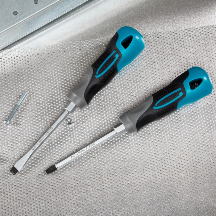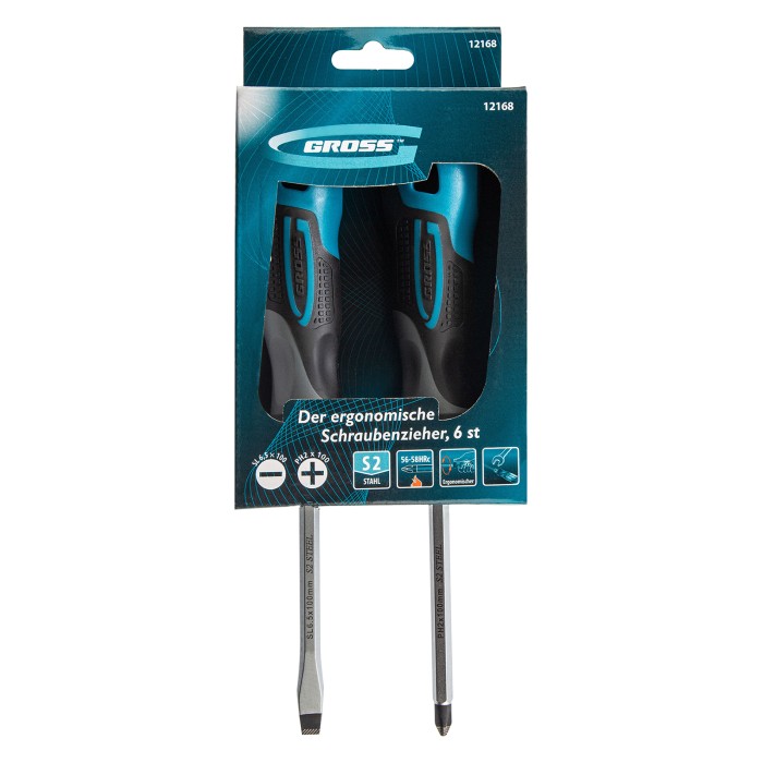 Комбинированный набор Gross 12168 включает 2 отвертки из стали S2, с трехкомпонентными рукоятками, позволяющих осуществлять монтаж/демонтаж крепежных элементов типа Philips и Slotted. Он используется для решения профессиональных задач при проведении строительных, ремонтных и монтажных работ. Длина стержней отверток составляет 75-100 мм, поэтому набор оптимален для работы с легкодоступными резьбовыми соединениями.ПреимуществаИзносостойкость и долговечность — отвертки изготовлены из высококачественной инструментальной стали S2.Высокий ресурс — стержни отверток прошли индукционную закалку, их твердость составляет 56-58 HRC.Удобство использования — шлицы со специальными насечками и фосфатным покрытием надежно сцепляются с головкой крепежа, что снижает риск его повреждения.Защита от ржавчины — хромовое покрытие стержней предотвращает образование коррозии.Намагниченные наконечники — крепеж удобно направлять в отверстие одной рукой, т.к. он не спадает со шлица.Расширенный функционал — шестигранные выступы на рукоятках позволяют использовать гаечный ключ для на 10 мм увеличения крутящего момента.Эргономичность — трехкомпонентные цельнолитые рукоятки надежно лежат в руке, что позволяет прикладывать меньше усилий во время работы.Крупная и четкая маркировка — на затыльнике каждой рукоятки указан типоразмер шлица, что упрощает поиск нужной отвертки под конкретную задачу.