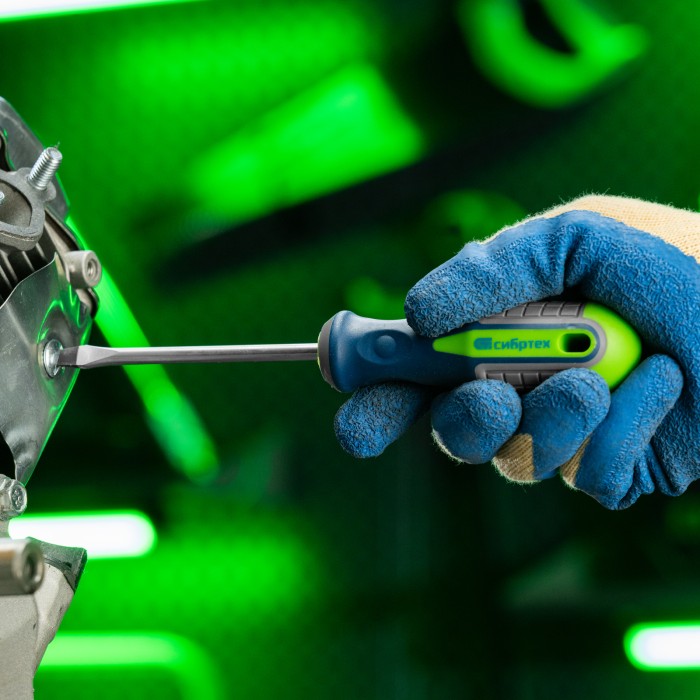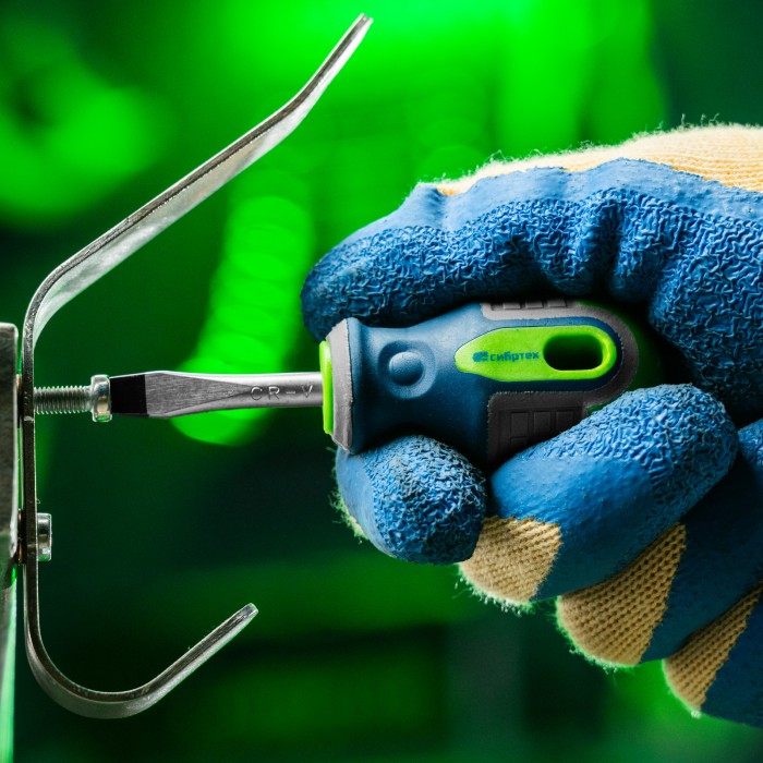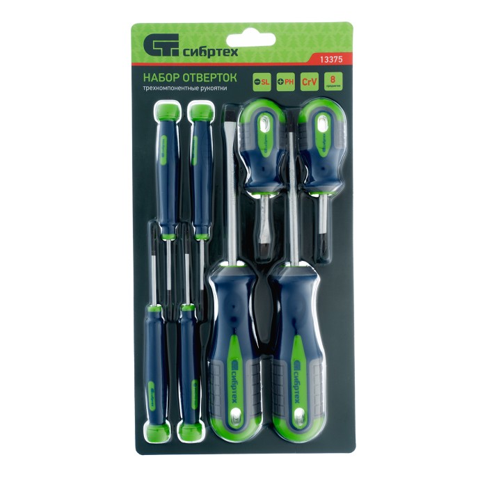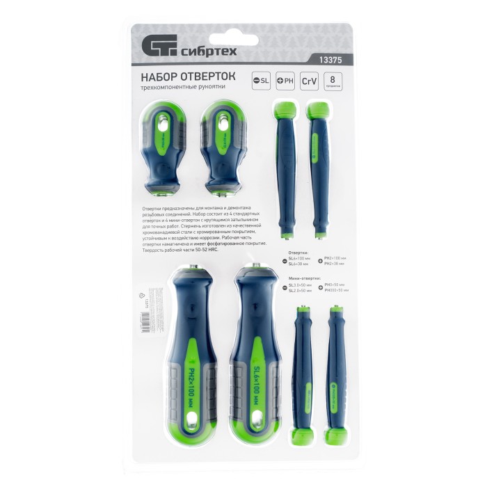 Универсальный набор отверток Сибртех 13375 включает 8 предметов из стали CrV, предназначенных для бытового использования. Отвертки используются для монтажа/демонтажа стандартных крепежных элементов и микровинтов с профилем SL и PH. В комплект входят инструменты с длиной стержней от 38 до 100 мм, что позволяет работать в узких пространствах и небольших углублениях.ПреимуществаКоррозионная и деформационная стойкость — стержни выполнены из стали CrV и покрыты хромом, наконечники отверток фосфатированы.Устойчивость к нагрузкам — рабочие части прошли дополнительную закалку до твердости 50-52 HRC.Комфортная работа — прорезиненные рукоятки с насечками не выскальзывают из ладони.Продуманная упаковка — набор поставляется в блистере, удобном для размещения на стенде.