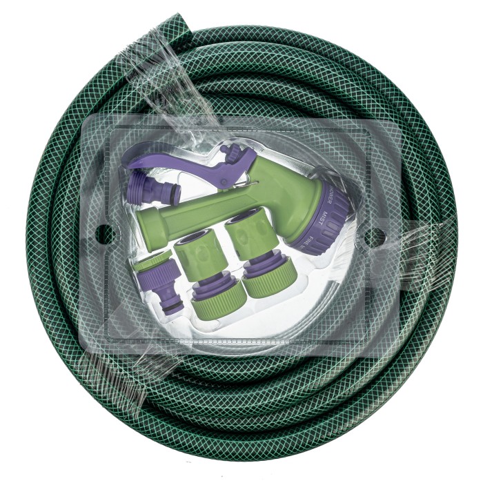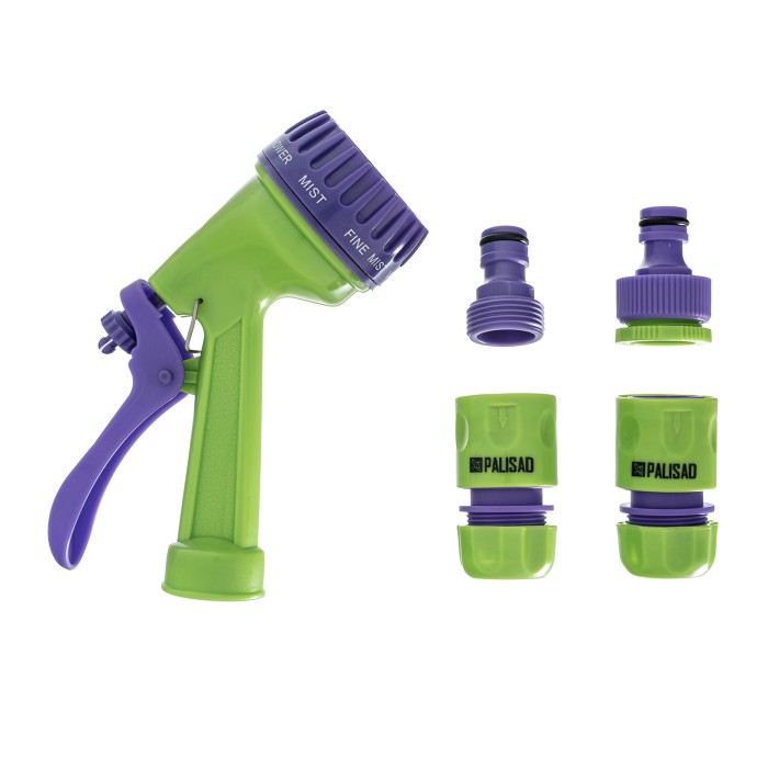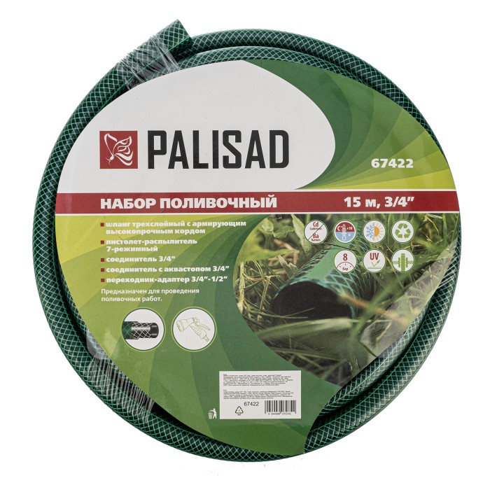 Поливочный набор Palisad 67422 состоит из шланга диаметром 3/4" и длиной 15 м, 7-режимного пистолета, соединителей и адаптера. Подключается к источнику водоснабжения через отвод или кран с внешней резьбой диаметром 3/4" или 1/2". Трехслойный шланг с армирующим слоем отличается повышенной прочностью и выдерживает давление до 10 бар. Он хорошо держит форму, не скручивается и рассчитан на интенсивное использование. Набор полностью готов к работе и будет полезен для ухода за дачным участком, парком или сквером.ПреимуществаПрочность и долговечность — шланг изготовлен из высококачественного ПВХ, устойчивого к ультрафиолету, дополнительные элементы набора выполнены из ABS-пластика и не боятся коррозии.Выбор оптимального режима полива — пистолет-распылитель позволяет регулировать мощность и тип струи.Экологичность — все детали изготовлены из безвредных материалов, их использование безопасно для окружающей среды. Универсальность — коннекторы, адаптер и пистолет-распылитель совместимы с элементами всех поливочных систем ТМ Palisad.