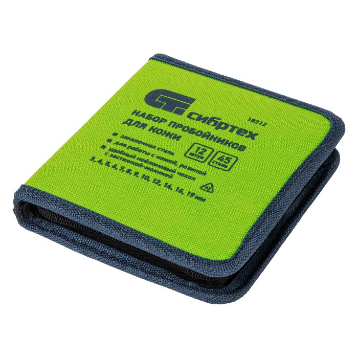 Набор пробойников для кожи Сибртех 18312, 12 шт. в чехле, позволяет пробить отверстия диаметром 3, 4, 5, 7, 6, 8, 9, 10, 12, 14, 16 и 19 мм посредством ударного воздействия от киянки. Инструменты предназначены для работы...