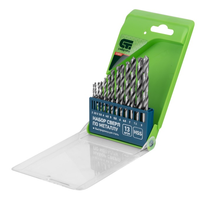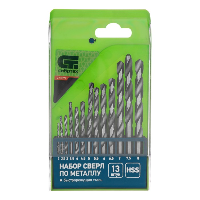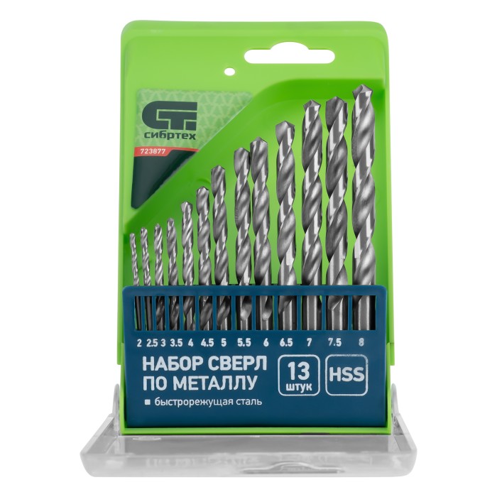 Набор сверл по металлу Сибртех 723877 диаметром 2-8 мм (через 0,5 мм), из стали HSS, с цилиндрическим хвостовиком, состоит из 13 шт. и упакован в пластиковую коробку. Используется для получения отверстий в черных металлах, в том числе стали и чугуне. Большой выбор оснасток позволяет точно подобрать необходимый размер. Набор поставляется в надежном пластиковом боксе и пригодится во время строительства и ремонта, а также будет полезен для бытовых работ.ПреимуществаПрочность — сверла изготовлены из быстрорежущей стали, устойчивой к механическому воздействию и перегреву.Высокий ресурс работоспособности — режущие кромки твердостью 62-64 HRC долго держат заточку.Универсальность — сверла с цилиндрическими хвостовиками совместимы со всеми типами патронов.Улучшенный отвод стружки — поверхность оснасток отполирована, что уменьшает их трение о стенки отверстий.Защита от заклинивания — диаметр направляющей части сверл уменьшается по направлению к хвостовику.Быстрый выбор оснастки — сверла помещены в гнезда с обозначениями размеров.
