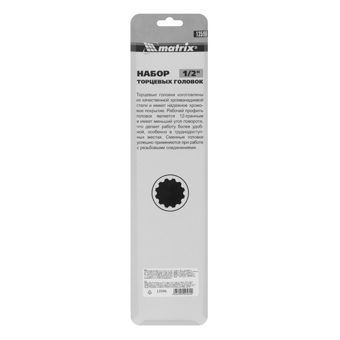 Набор из 10 торцевых головок размером 10-24 мм Matrix 13596 с присоединительным квадратом 1/2", с 12-гранным профилем, из стали CrV, предназначен для работы с резьбовыми соединениями. Насадки будут полезны автовладельцу, работнику автосервиса и домашнему мастеру.ПреимуществаУдобная работа в тесном пространстве — благодаря 12-гранному профилю головки требуется повернуть инструмент всего на 30° для перестановки.Высокий ресурс — насадки изготовлены из хромованадиевой стали, рабочие части закалены до твердости 42 HRC.Защита от разрушения — полированное хромоникелевое покрытие предотвращает образование коррозии.Быстрый поиск нужной торцевой головки — на корпусах насадок имеются красные полоски и маркировка с обозначением размера.Удобное хранение — благодаря металлической планке-держателю торцевые головки всегда будут под рукой и не потеряются.