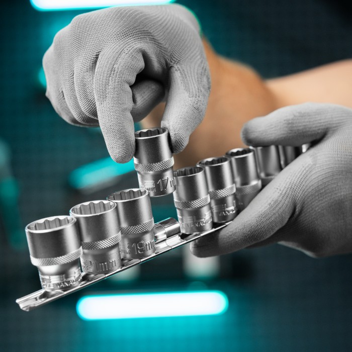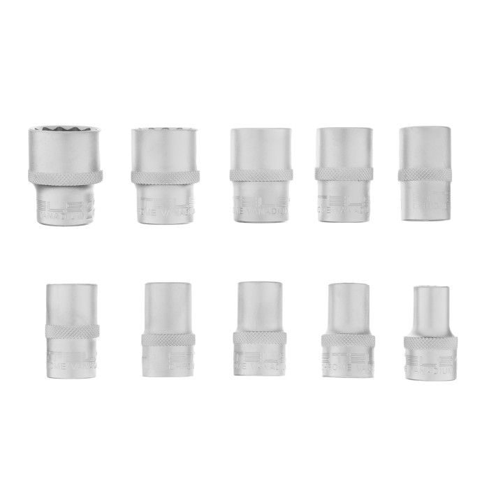 Головка торцевая, 10 мм - 1 штГоловка торцевая, 11 мм - 1 штГоловка торцевая, 12 мм - 1 штГоловка торцевая, 13 мм - 1 штГоловка торцевая, 14 мм - 1 штГоловка торцевая, 16 мм - 1 штГоловка торцевая, 17 мм - 1 штГоловка торцевая, 19 мм - 1 штГоловка торцевая, 21 мм - 1 штГоловка торцевая, 22 мм - 1 штМеталлическая плашка-держатель - 1 шт