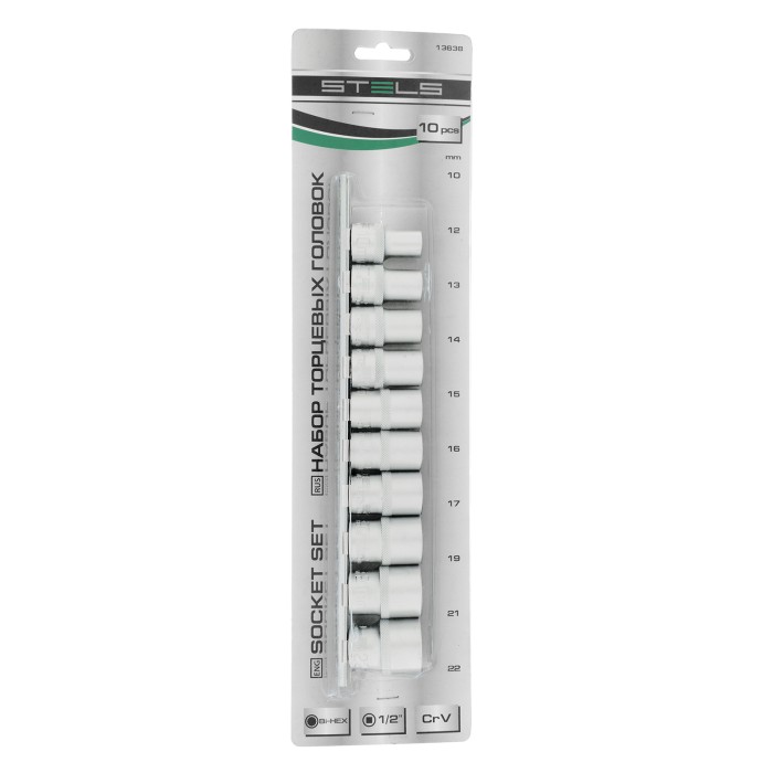 Набор торцевых головок, 1/2, двенадцатигранные, CrV, 10 шт, 10-22 мм Stels