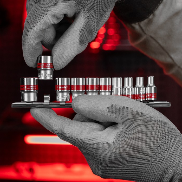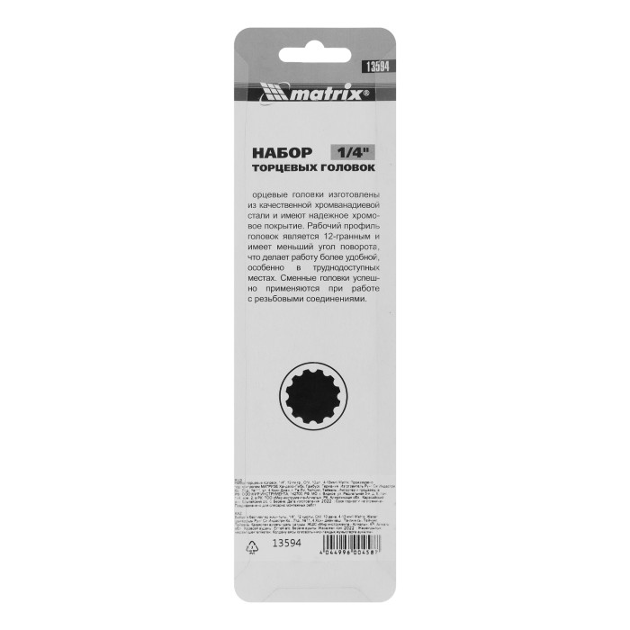 Набор из 10 торцевых головок размером 4-13 мм Matrix 13594 с присоединительным квадратом 1/4", с 12-гранным профилем, из стали CrV, предназначен для работы с небольшими резьбовыми соединениями. Насадки будут полезны автовладельцу, работнику автосервиса и домашнему мастеру.ПреимуществаУдобная работа в тесном пространстве — благодаря 12-гранному профилю головки требуется повернуть инструмент всего на 30° для перестановки.Высокий ресурс — насадки изготовлены из хромованадиевой стали, рабочие части закалены до твердости 42 HRC.Защита от разрушения — полированное хромоникелевое покрытие предотвращает образование коррозии.Быстрый поиск нужной торцевой головки — на корпусах насадок имеются красные полоски и маркировка с обозначением размера.Удобное хранение — благодаря металлической планке-держателю торцевые головки всегда будут под рукой и не потеряются.