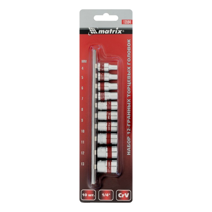 Набор торцевых головок, 1/4", 12 гранные, CrV, 4-13мм, 10 штук Matrix
