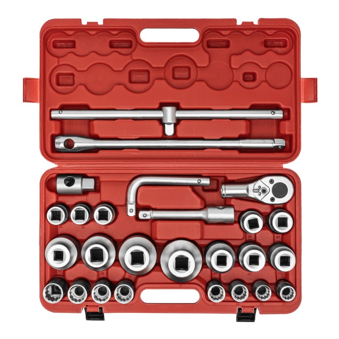 Ключ трещотка - 1 штВороток Т-образный T-образный - 1 штУдлинитель 190, 510 - 2 штВороток Т-образный L-образный - 1 штПереходник - 1 штГоловки 21, 22, 23, 24, 26, 27, 28, 29, 30, 31, 32, 34, 36, 38, 41, 46, 50, 55, 60, 65 - 20 штКейс - 1 шт