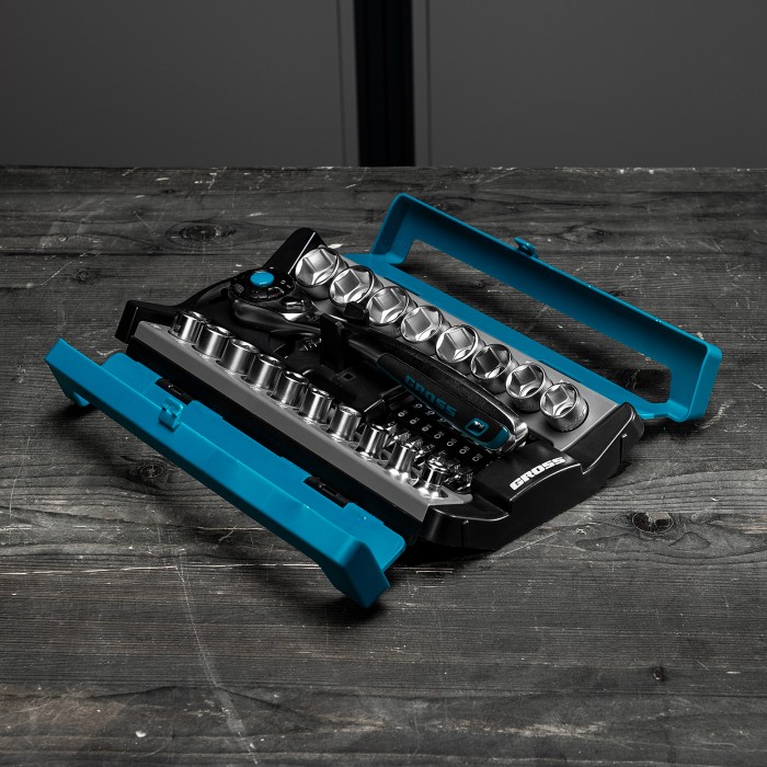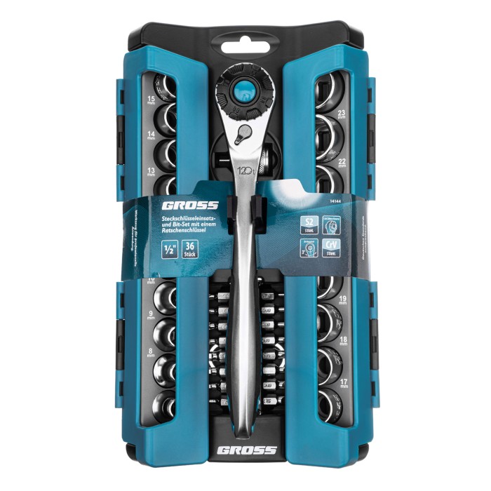 Набор Gross 14144 включает в себя 36 предметов с посадочным квадратом 1/2″: 17 торцевых головок, трещотку со 120 зубьями, переходник, адаптер и 16 бит. Применяется для монтажа и демонтажа резьбовых соединений при проведении технического обслуживания авто или для бытовых ремонтных работ. Набор подходит не только для самостоятельного использования в гараже и дома, но и для профессиональной эксплуатации на станциях техобслуживания.ПреимуществаПрочность и высокий ресурс — инструменты выполнены из качественной стали CrV, биты изготовлены из японской легированной стали S2.Удобная работа в труднодоступных местах — цельнокованая трещотка со 120 зубьями позволяет вращать крепеж максимально плавно и мягко.Функция быстрого сброса — снять оснастку с трещотки можно одним движением.Наличие реверса — можно быстро менять направление вращения трещотки для легкого перехода от монтажа к демонтажу крепежей.Удобное хранение и транспортировка — набор поставляется в прочном пластиковом боксе.