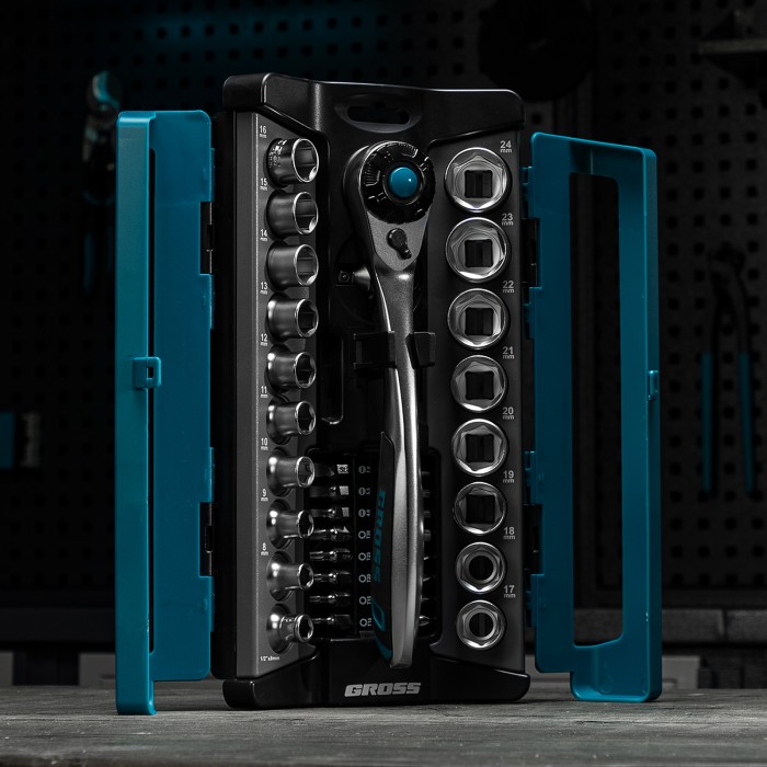 Набор торцевых головок, трещотка 120 зубьев, 1/2", CrV, 36 предметов Gross