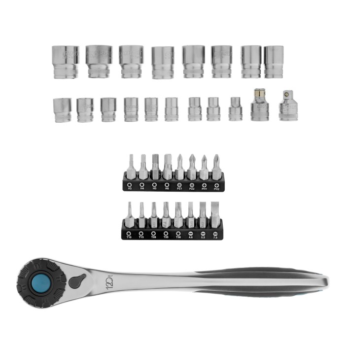 Ключ трещоточный - 1 штАдаптер для бит - 1 штПереходник - 1 штБиты-вставки PH, PZ, SL, H, T, - 16 штГоловки 8, 9, 10, 11, 12, 13, 14, 15, 16, 17, 18, 19, 20, 21, 22, 23, 24 - 17 штКейс - 1 шт