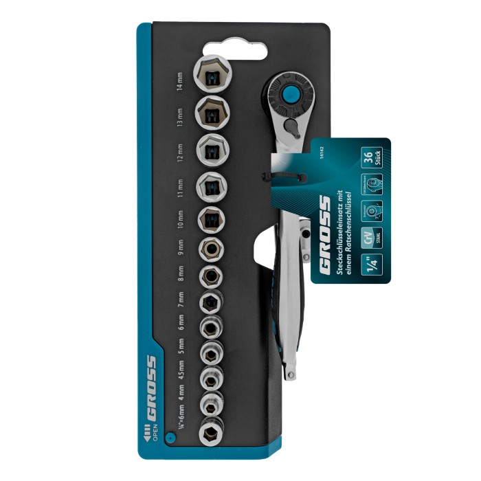 Набор торцевых головок, трещотка 120 зубьев, 1/4", CrV, 36 предметов Gross