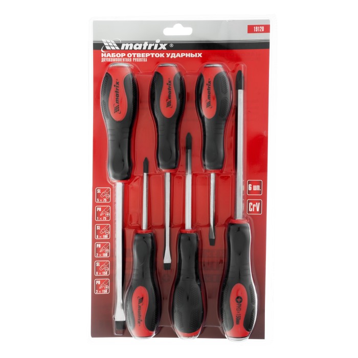 Набор Matrix 19120 из стали CrV состоит из 6 ударных отверток типоразмеров PH1x75, PH2x100, PH3x150, SL5x75, SL6x100, SL8x150. Предназначен для работы с резьбовым крепежом, в том числе для демонтажа перетянутых или заржавевших соединений. У каждой отвертки имеется металлический затыльник, выдерживающий удары молотком или киянкой. Набор рекомендован для профессионального использования и будет полезен во время ремонта оборудования или автотехники.ПреимуществаПрочность и износостойкость — стержни изготовлены из высококачественной хромованадиевой стали.Повышенная устойчивость к ударным нагрузкам — усиленные стержни шестигранной формы проходят сквозь рукоятки.Антикоррозийная защита — наконечники прошли фосфатирование.Комфортная работа — двухкомпонентные рукоятки с рельефными зонами не выскальзывают из ладони.