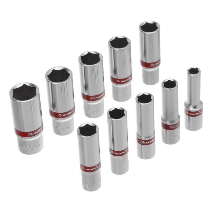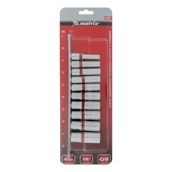 Набор удлиненных торцевых головок 3/8", 6 гранные, CrV, 8-19мм, 10 штук Matrix