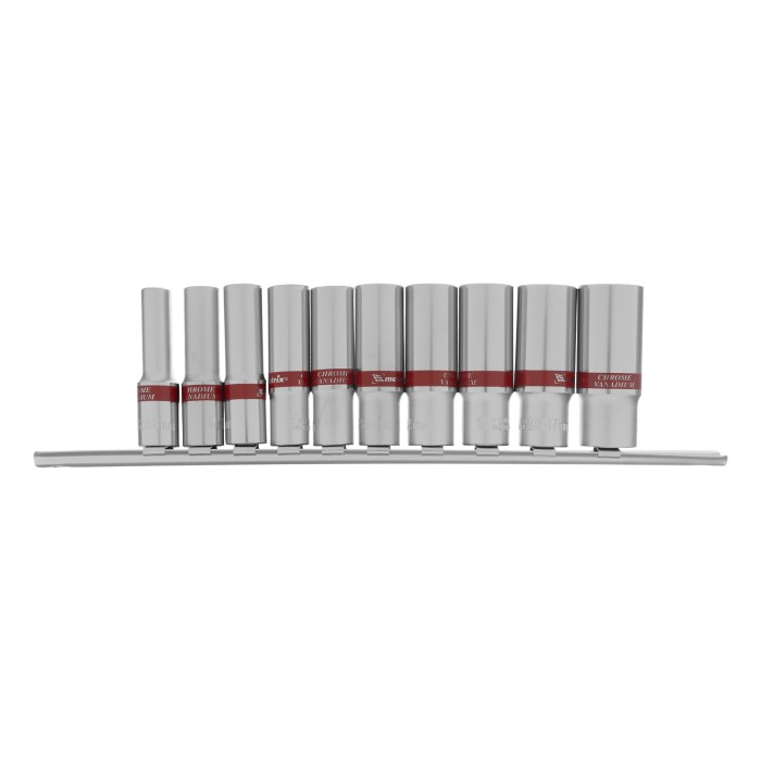 Головка торцевая удлиненная, 8 мм - 1 штГоловка торцевая удлиненная, 10 мм - 1 штГоловка торцевая удлиненная, 11 мм - 1 штГоловка торцевая удлиненная, 12 мм - 1 штГоловка торцевая удлиненная, 13 мм - 1 штГоловка торцевая удлиненная, 14 мм - 1 штГоловка торцевая удлиненная, 15 мм - 1 штГоловка торцевая удлиненная, 16 мм - 1 штГоловка торцевая удлиненная, 17 мм - 1 штГоловка торцевая удлиненная, 19 мм - 1 штМеталлическая плашка-держатель - 1 шт
