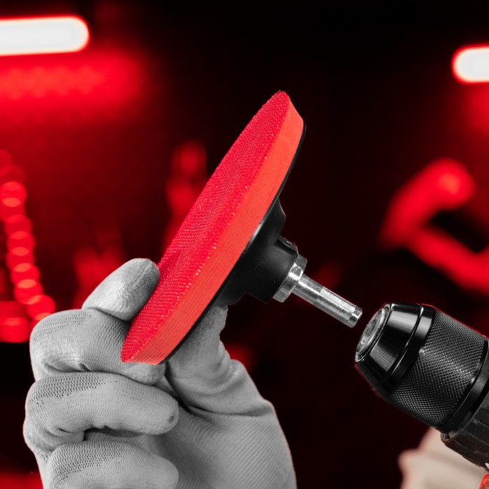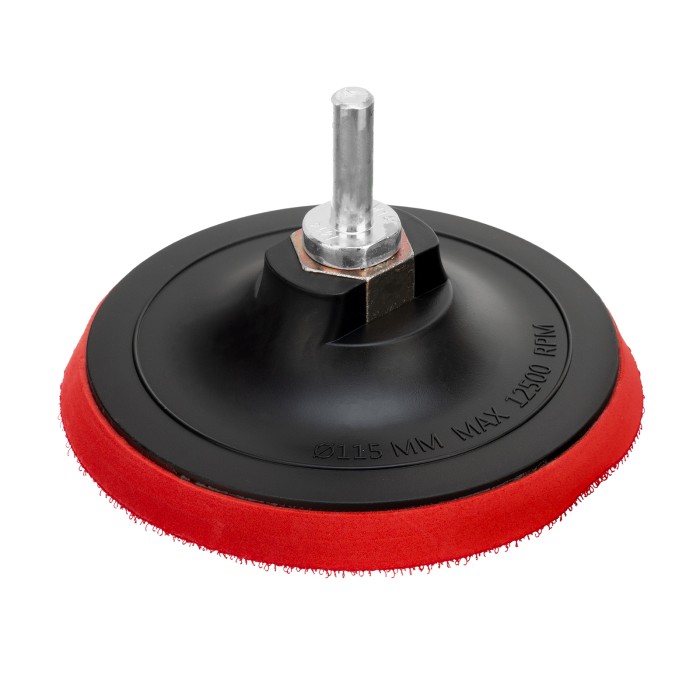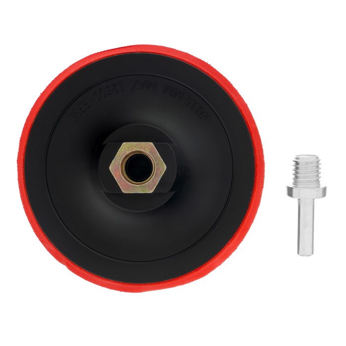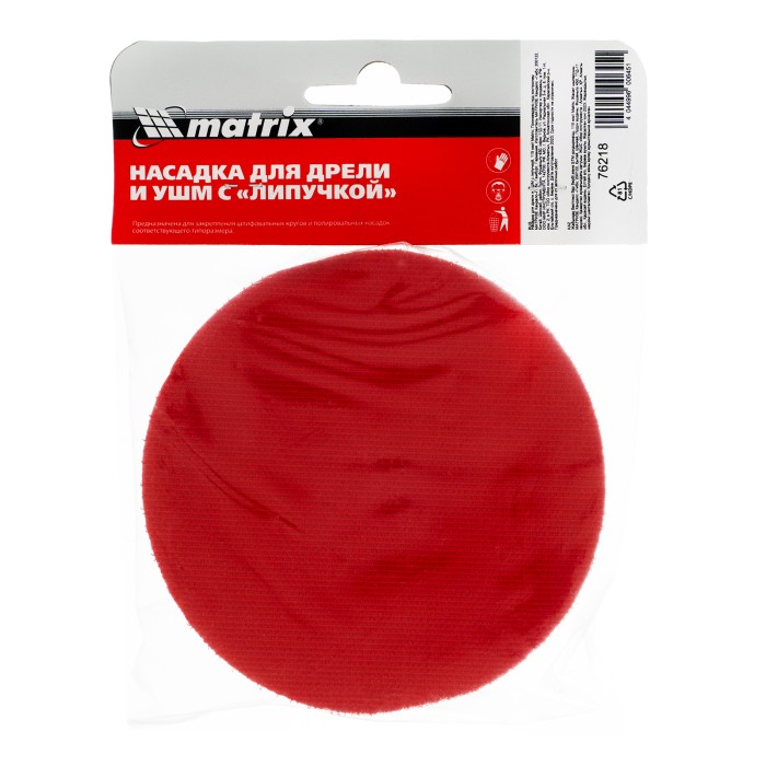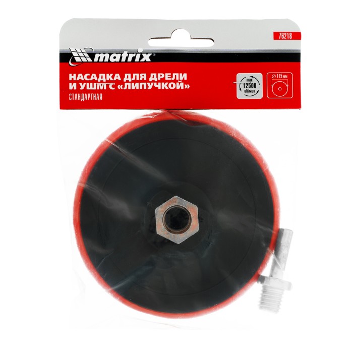 Насадка для дрели и УШМ с липучкой Matrix 76218 используется с дрелями и углошлифовальными машинами, поддерживающими оснастки диаметром 115 мм и имеющими рабочий диапазон вращения до 12500 об/мин. Предназначена для установки абразивных и полировальных кругов на ворсовой подложке. Насадка с демпферной вставкой из вспененного этиленвинилацетата (EVA) универсальна и подходит для всех видов полировальных и шлифовальных работ.ПреимуществаНадежная фиксация и быстрая замена круга под «липучку» — нейлоновая рабочая поверхность оснащена крючками velcro.Возможность установки на дрель — в комплекте имеется адаптер-переходник с резьбой М14 и хвостовиком диаметром 8 мм для фиксации в патроне дрели.Защита от коррозии — посадочная гайка и переходник оцинкованы.