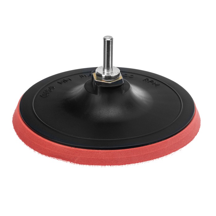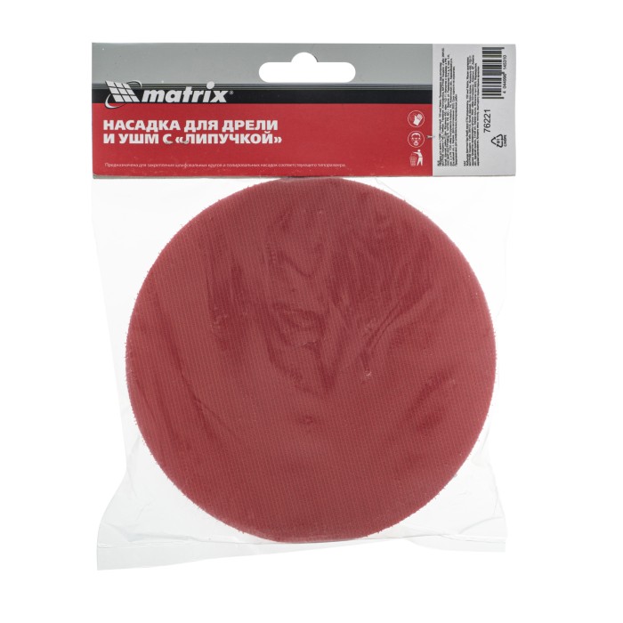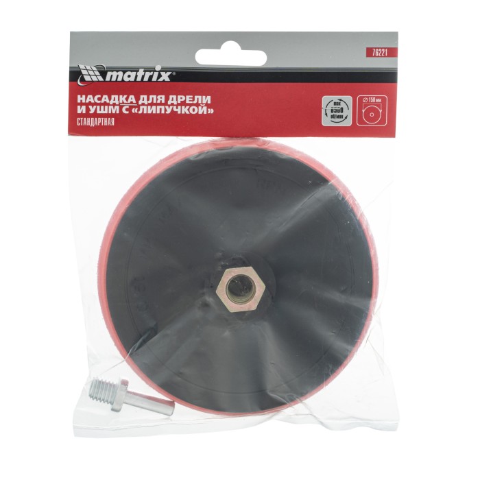 Насадка для дрели и УШМ с липучкой Matrix 76221 используется с дрелями и углошлифовальными машинами, поддерживающими оснастки диаметром 150 мм и имеющими рабочий диапазон вращения до 8500 об/мин. Предназначена для установки абразивных и полировальных кругов на ворсовой подложке. Насадка с демпферной вставкой из вспененного этиленвинилацетата (EVA) универсальна и подходит для всех видов полировальных и шлифовальных работ.ПреимуществаНадежная фиксация и быстрая замена круга под «липучку» — нейлоновая рабочая поверхность оснащена крючками velcro.Возможность установки на дрель — в комплекте имеется адаптер-переходник с резьбой М14 и хвостовиком диаметром 8 мм для фиксации в патроне дрели.Защита от коррозии — посадочная гайка и переходник оцинкованы.