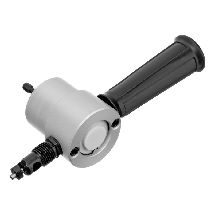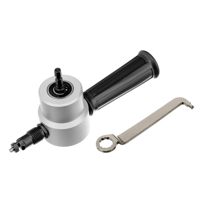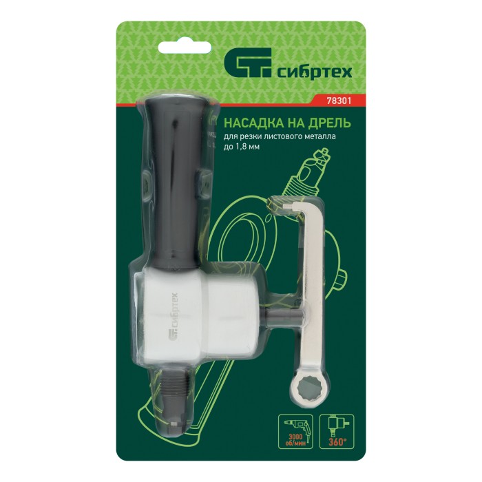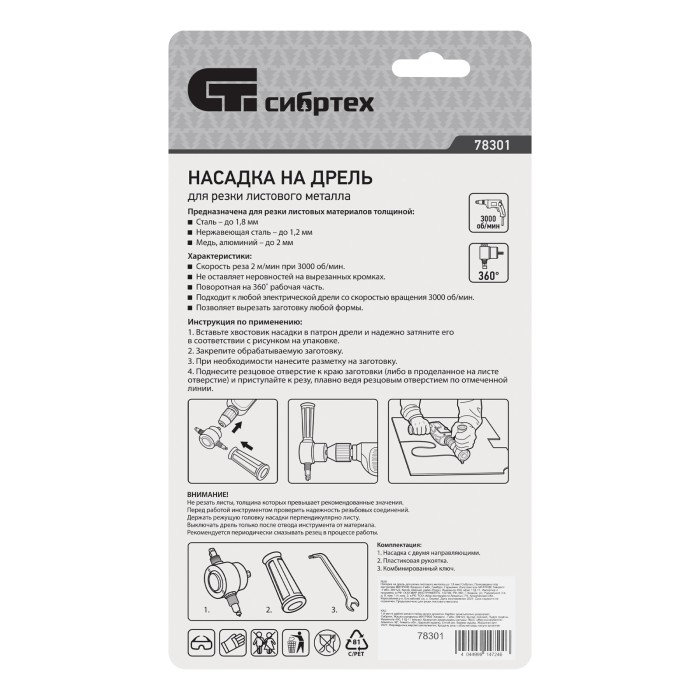 Насадка на дрель для резки листового металла Сибртех 78301 позволяет разрезать сталь толщиной до 1,8 мм, нержавеющую сталь толщиной до 1,2 мм, медь и алюминий — до 2 мм. Ширина реза составляет 6 мм, он может быть не только прямым, но и фигурным. Приспособление устанавливается на электрические дрели со скоростью вращения 3000 об/мин. Насадка для резки металла будет полезна при проведении кровельных работ, а также пригодится в слесарной мастерской, на даче или в гараже.ПреимуществаВысокое качество реза — кромки среза получаются ровными, без заусенцев.Свободное движение по всей плоскости металла в любом направлении — рабочая часть вращается на 360 градусов.Увеличенный срок эксплуатации — насадка оснащена двумя ножами, если один затупится, достаточно переставить на него рукоятку, освободив второй, и продолжить работу.Комфорт при использовании — удобная пластиковая рукоятка позволяет без усилий удерживать инструмент.