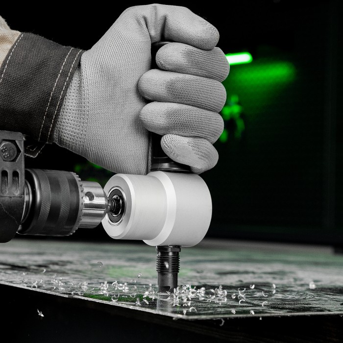 Насадка на дрель для резки листового металла Сибртех 78301 позволяет разрезать сталь толщиной до 1,8 мм, нержавеющую сталь толщиной до 1,2 мм, медь и алюминий — до 2 мм. Ширина реза составляет 6 мм, он может быть не толь...