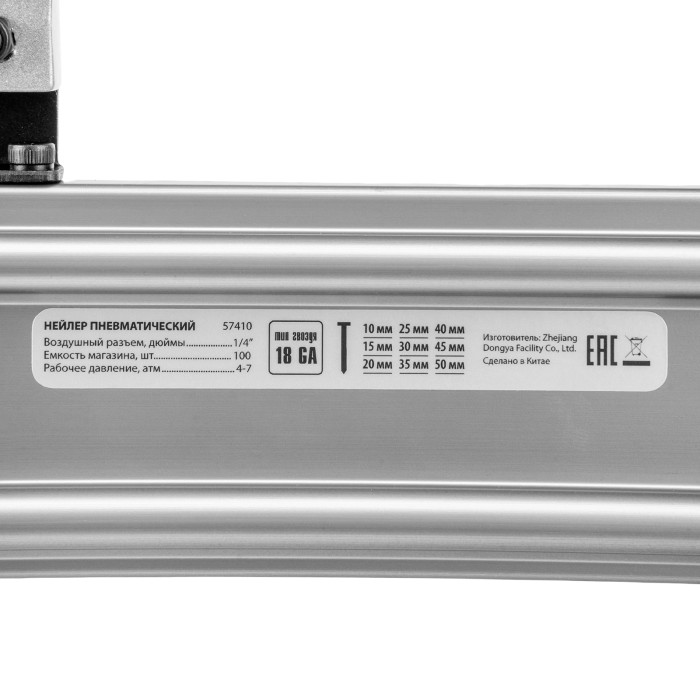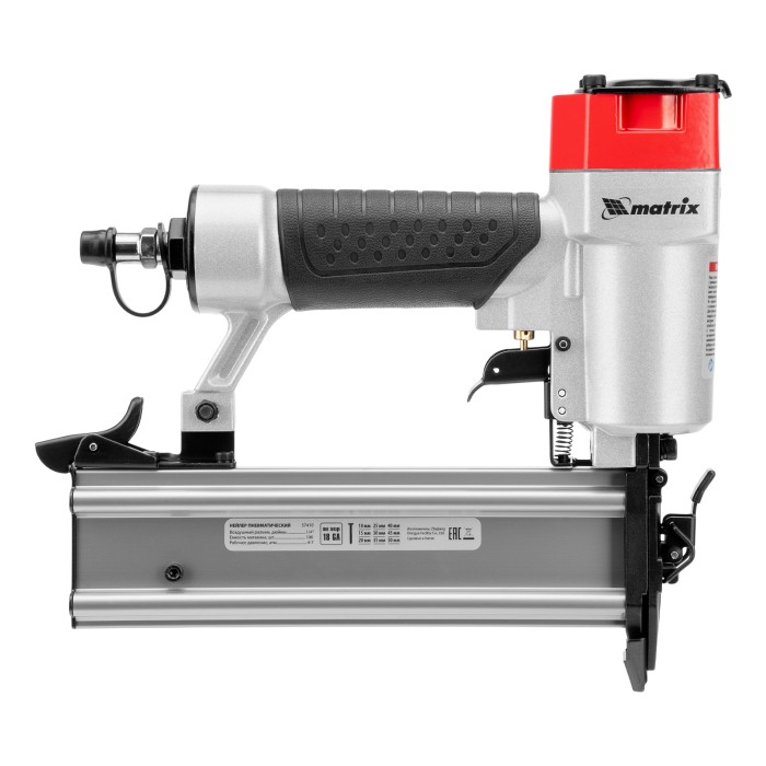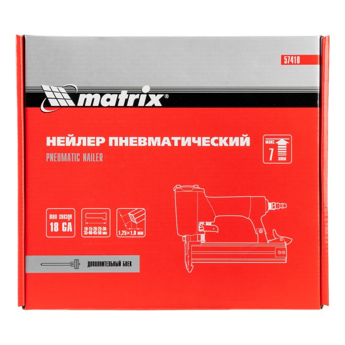 Пневматический нейлер Matrix 57410 совместим с гвоздями 18GA длиной от 10 до 50 мм и используется во время строительства и ремонта. Упрощает и ускоряет монтаж каркасов, плинтусов, обшивки, утеплителя и напольных покрытий.ПреимуществаМагазин на 100 гвоздей — одной обоймы хватает надолго, что позволяет сэкономить время на зарядку инструмента.Быстрая подготовка к работе — установка обоймы занимает несколько секунд.Прочность — алюминиевый корпус устойчив к механическим повреждениям.Комфортная работа — обрезиненная ручка обеспечивает удобный хват инструмента.Вес 1,4 кг — мастер сможет длительное время работать без усталости.Гарантия 3 года — высокое качество инструмента подтверждено производителем.