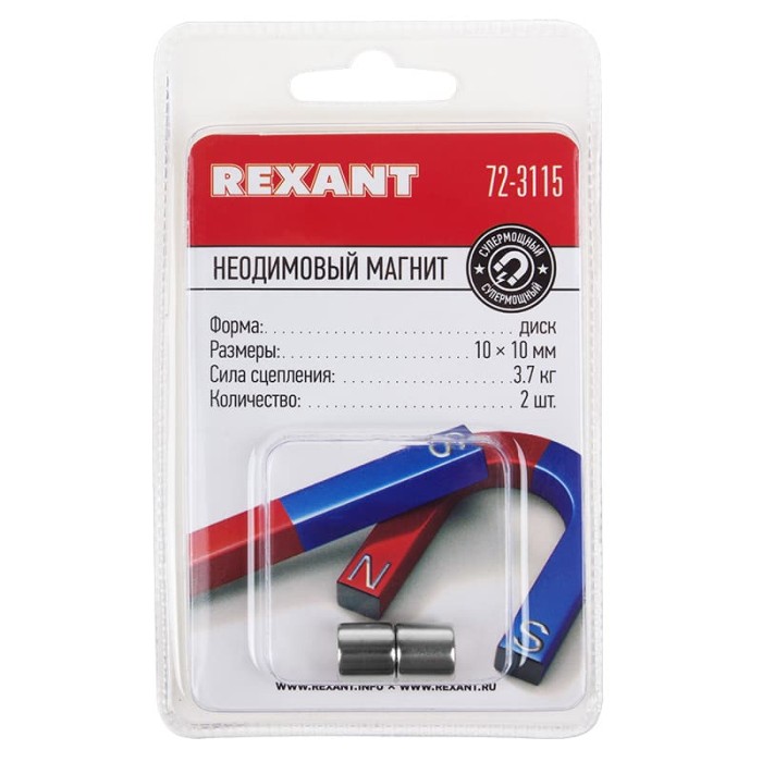 Неодимовый магнит диск 10х10мм, сцепление 3,7кг (2 шт/уп) REXANT