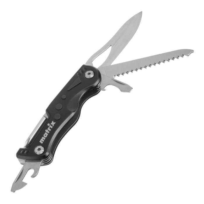 Многофункциональный нож Matrix 17624 длиной 107 мм имеет 7 функций и поставляется с чехлом. Способен резать картон и другие материалы, откручивать и закручивать резьбовой крепеж, открывать бутылки и консервные банки. Складной нож будет полезен дома, на даче, на пикнике, охоте или рыбалке, также пригодится в гараже.ПреимуществаПрочность и долговечность — инструмент изготовлен из стали.Удобное хранение и транспортировка — трансформер поставляется с чехлом.Компактность — общая длина ножа в разложенном состоянии составляет 107 мм, его можно носить в сумке или рюкзаке.