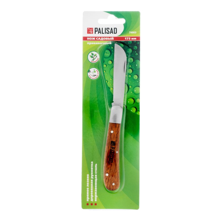 Садовый складной нож Palisad 79003 длиной 173 мм, с прямым лезвием и деревянной рукояткой, предназначен для удаления сучьев, нарезки черенков, срезания шипов, зачистки срезов и т.д. Складной нож удобен и безопасен в хранении и транспортировке. Инструмент будет полезен владельцам дачных участков. Во избежание преждевременного износа лезвия рекомендуется протирать его салфеткой и смазывать маслом после каждого применения.ПреимуществаПрочность и долговечность — лезвие изготовлено из нержавеющей стали, закаленной до твердости 48-50 HRC.Высокий ресурс — остро заточенная кромка долго сохраняет режущие свойства.Устойчивость к разрушению — рукоятка пропитана маслом для защиты от воздействия влаги и УФ-лучей.Эргономичность — благодаря выемке на лезвии нож легко открывается.Комфортная работа — рукоятка из древесины ротанговой пальмы приятна на ощупь.