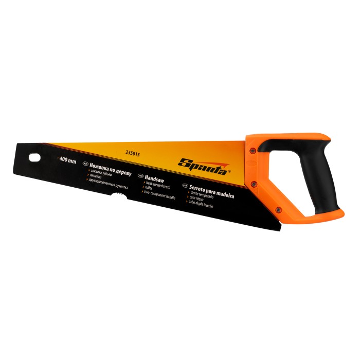 Ножовка по дереву Sparta 235015 с полотном длиной 400 мм, с калеными зубьями с 2D-заточкой и шагом 7-8 TPI, с двухкомпонентной рукояткой, используется во время столярных и плотницких работ. Зубья имеют двухгранную заточку, поэтому ножовкой можно пилить как от себя, так и на себя. Шаг зубьев составляет 7-8 TPI, что обеспечивает быстрый рез. В случае снижения производительности пилы ее рабочую кромку можно заточить.ПреимуществаПрочность и износостойкость — полотно из пружинной стали 65Mn устойчиво к динамическим нагрузкам, каленые зубья твердостью 55 HRC долго сохраняют режущую способность.Долговечность — полотно покрыто лаком для защиты от коррозии.Надежность — полотно, закрепленное 3 винтами, не выпадет во время пиления.Комфортная работа — двухкомпонентная эргономичная рукоятка надежно лежит в руке.