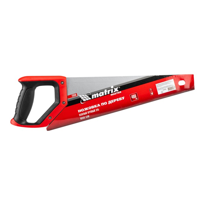 Ножовка по дереву Matrix 23556 с полотном длиной 400 мм, с крупными калеными зубьями с шагом 5-6 TPI и 2D-заточкой, с двухкомпонентной рукояткой, используется для быстрой продольной или поперечной распиловки древесины. Высокая скорость работы достигается благодаря крупным зубьям с волновой заточкой и универсальным шагом 4-5 мм. Двухгранная заточка зубьев дает возможность пилить в направлении как от себя, так и на себя, а также перетачивать режущую кромку при необходимости. Ножовка подходит для выполнения плотницких и хозяйственных работ.ПреимуществаПрочность и долговечность — полотно изготовлено из пружинной стали 65Mn и покрыто лаком для защиты от коррозии.Высокий ресурс — благодаря закаленным зубьям рабочая кромка долго сохраняет режущие свойства.Комфортная работа — эргономичная рукоятка с рельефной поверхностью не выскальзывает из руки.Подтвержденное качество — ножовка произведена под строгим технологическим контролем.