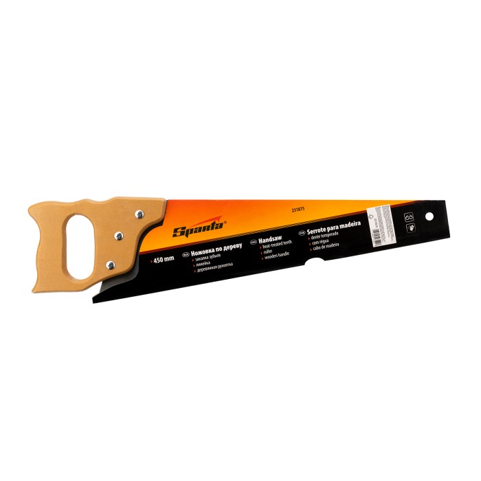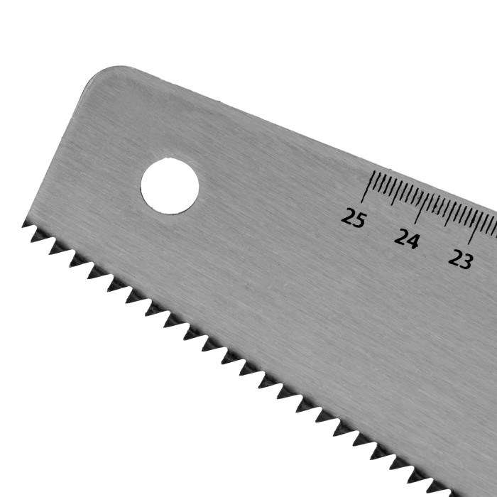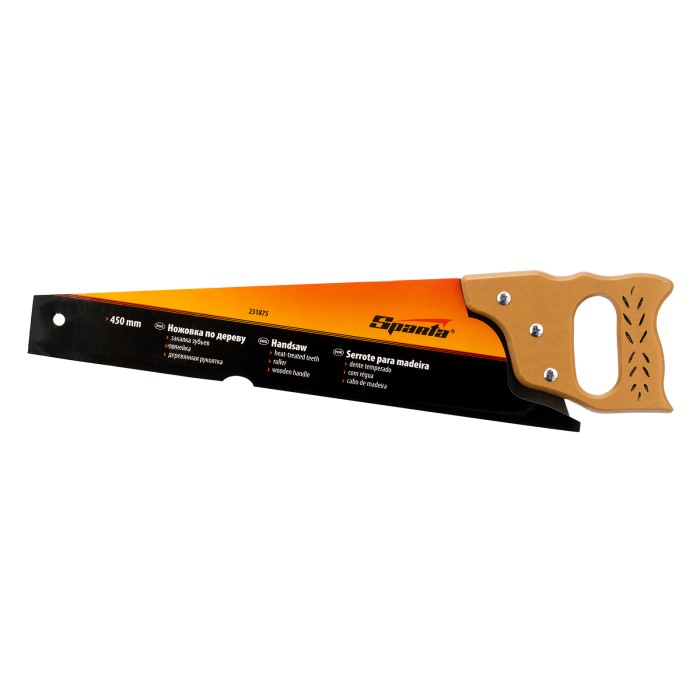 Ножовка по дереву Sparta 231875 с полотном длиной 450 мм, с калеными зубьями с шагом 7-8 TPI, с линейкой и деревянной рукояткой, предназначена для продольно-поперечного распиливания древесины. Благодаря зубьям с 2D-заточкой подходит для двухстороннего реза. Режущую кромку можно перетачивать. На полотно нанесена измерительная шкала, позволяющая производить замеры, не тратя время на поиск линейки. Ножовка используется в столярном и плотницком деле, а также полезна дома и на даче.ПреимуществаПрочность — полотно изготовлено из пружинной холоднокатаной стали 65Mn, характеризующейся стойкостью к постоянным нагрузкам.Высокий ресурс — зубья закалены до твердости 55 HRC и хорошо держат заточку.Производительность — крупные зубья с шагом 7-8 TPI обеспечивают быстрый рез. Устойчивость к коррозии — на полотно нанесено защитное лаковое покрытие.Надежность — полотно крепко зафиксировано в рукоятке при помощи винтов.Комфорт во время работы — рукоятка выполнена из дерева и покрыта лаком для защиты от рассыхания и разбухания.