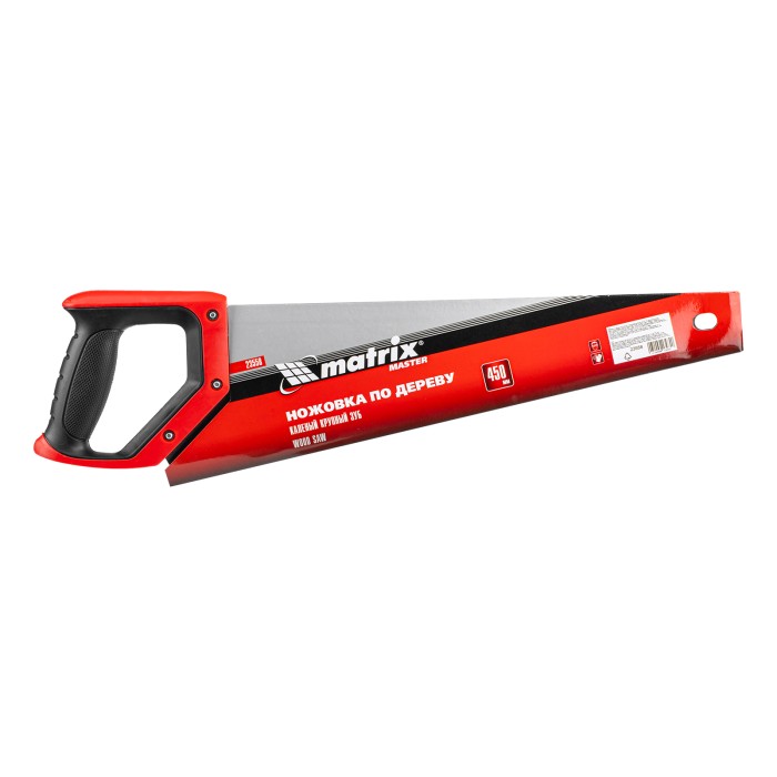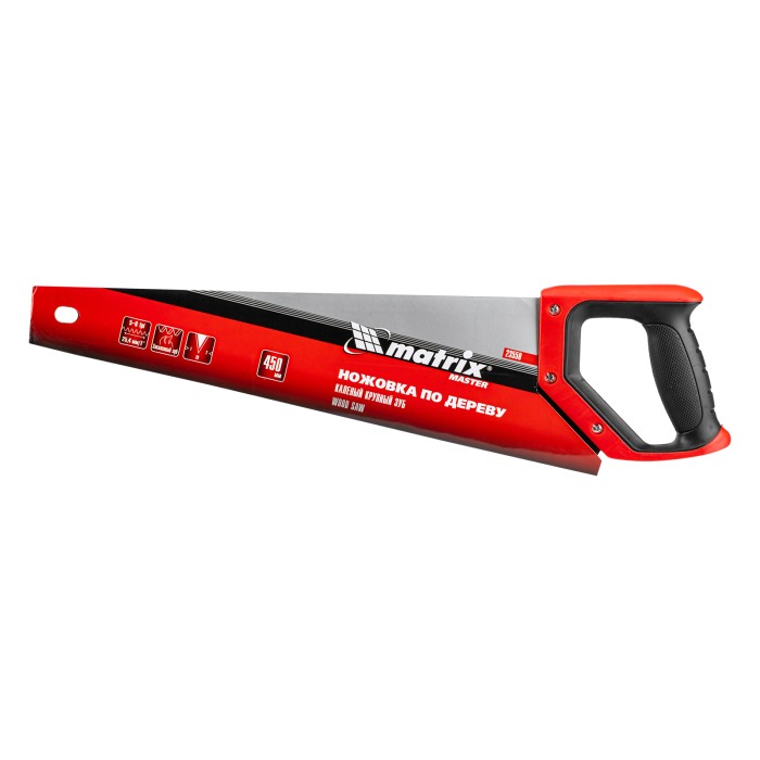 Ножовка по дереву Matrix 23558 с полотном длиной 450 мм, с крупными калеными зубьями с шагом 5-6 TPI и 2D-заточкой, с двухкомпонентной рукояткой, используется для быстрой продольной или поперечной распиловки древесины. Высокая скорость работы достигается благодаря крупным зубьям с волновой заточкой и универсальным шагом 4-5 мм. Двухгранная заточка зубьев дает возможность пилить в направлении как от себя, так и на себя, а также перетачивать режущую кромку при необходимости. Ножовка подходит для выполнения плотницких и хозяйственных работ.ПреимуществаПрочность и долговечность — полотно изготовлено из пружинной стали 65Mn и покрыто лаком для защиты от коррозии.Высокий ресурс — благодаря закаленным зубьям рабочая кромка долго сохраняет режущие свойства.Комфортная работа — эргономичная рукоятка с рельефной поверхностью не выскальзывает из руки.Подтвержденное качество — ножовка произведена под строгим технологическим контролем.
