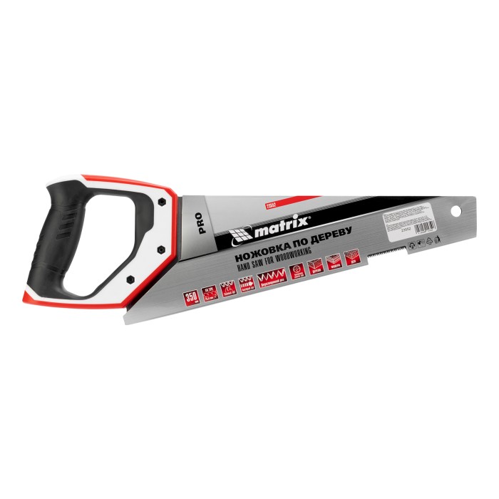 Ножовка по дереву Matrix PRO 23552 с полотном длиной 350 мм, калеными зубьями с шагом 14 TPI и 3D-заточкой, с трехкомпонентной рукояткой, предназначена для точных пильных работ с заготовками из древесины, фанеры и ДСП. Подходит для продольного и поперечного пиления. Шаг зубьев составляет 14 TPI, что обеспечивает точность реза. 3D-заточка зубьев увеличивает производительность ножовки. Инструмент будет полезен в столярной мастерской, а также пригодится в быту. ПреимуществаНадежность — полотно изготовлено из пружинной стали 65Mn и зафиксировано в рукоятке 3 винтами.Высокий ресурс — зубья, закаленные до твердости 46-52 HRC, долго держат заточку.Защита от разрушения — лаковое покрытие предохраняет полотно от коррозии.Комфортная работа без ощущения усталости — трехкомпонентная обрезиненная рукоятка удобно ложится в руку и не выскальзывает из ладони.Гарантированное качество — ножовка изготовлена на японском оборудовании с соблюдением всех технологических норм.