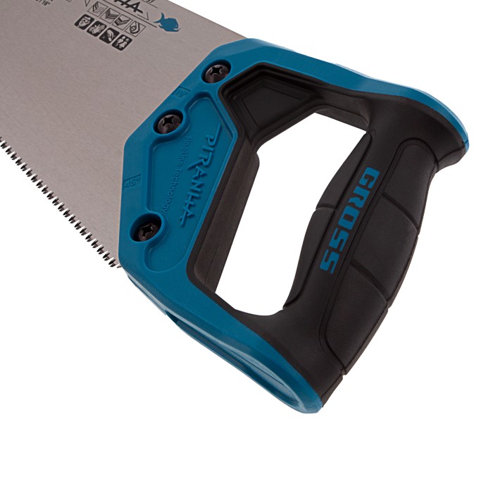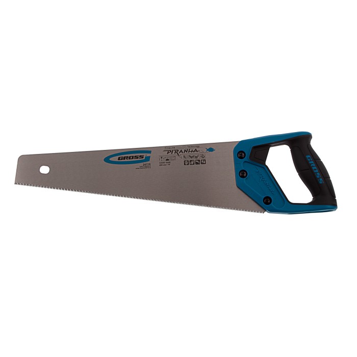 Ножовка по дереву Gross PIRANHA 24110 с полотном длиной 400 мм, калеными зубьями с 3D-заточкой и шагом 11-12 TPI, 2-компонентной рукояткой, предназначена для распиловки заготовок из древесины, ДСП, ДВП, МДФ и ламината, а...