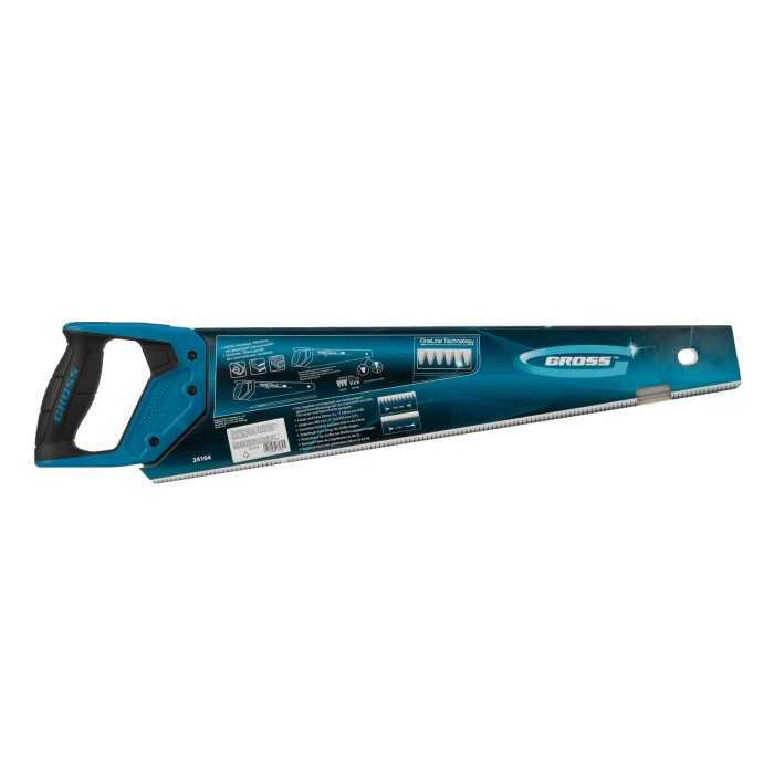 Ножовка по дереву Gross PIRANHA 24104 с полотном длиной 500 мм, калеными зубьями с 3D-заточкой и шагом 11-12 TPI, с 2-компонентной рукояткой, предназначена для распиловки заготовок из древесины, ДСП, ДВП, МДФ и ламината, а также из пластических материалов, таких как пенополистирол и полиуретан. Может производить продольный и поперечный распил. Мелкие зубья с шагом 11-12 TPI позволяют выполнять точный и чистый рез. Ножовка обладает высокой производительностью благодаря трехгранной заточке зубьев. Инструмент используется в столярном деле.ПреимуществаНадежность — полотно изготовлено из высококачественной японской стали SK-5, а рукоятка — из ударопрочного ABS-пластика.Эффективная работа — зубья, закаленные токами высокой частоты, долго держат заточку.Прочность — закалка зубьев на 2/3 высоты уменьшает вероятность их слома при обработке древесины твердых пород.Коррозионная стойкость — на полотно нанесено защитное полимерное покрытие.Комфорт во время работы — благодаря эргономичной форме и рифленой поверхности рукоятка удобно ложится в руку и не выскальзывает из ладони.Гарантированное качество — инструмент изготовлен на тайваньском заводе с соблюдением всех технологических требований.