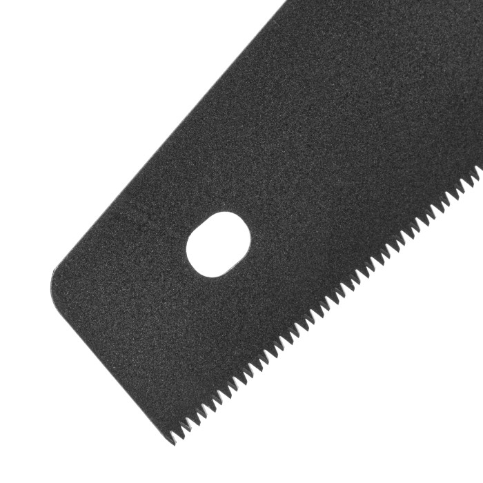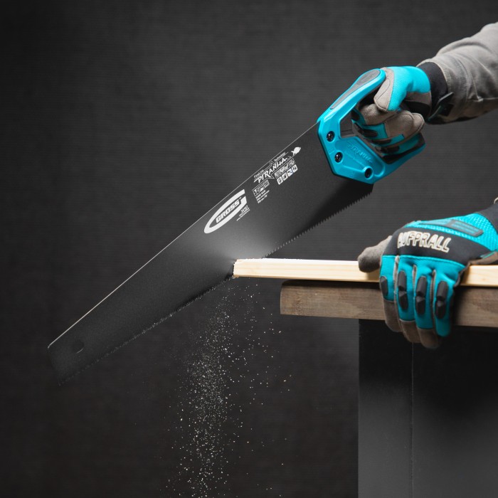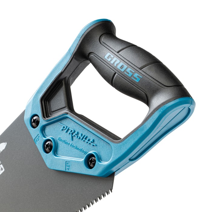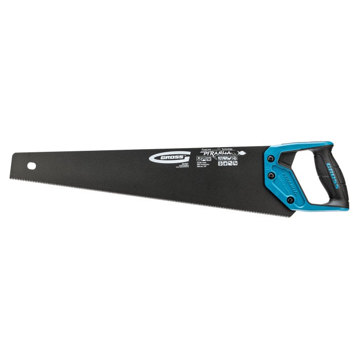 Ножовка по дереву Gross PIRANHA 24107 с полотном длиной 500 мм, калеными зубьями с 3D-заточкой и шагом 11-12 TPI, с тефлоновым покрытием полотна и 2-компонентной рукояткой, используется для продольного и поперечного распиливания древесины различных пород, МДФ, ДСП, ДВП, ламината, а также пенополистирола, полиуретана и других синтетических материалов. Рабочая часть состоит из мелких зубьев с шагом 2-2,3 мм, что позволяет получить ровный и чистый рез. Трехгранная заточка зубьев увеличивает производительность инструмента без потери качества распиловки. Ножовка предназначена для столярных работ.ПреимуществаНадежность — полотно изготовлено из японской пружинной стали SK-5, а рукоятка — из ударопрочного ABS-пластика.Эффективная работа — зубья прошли закалку токами высокой частоты, поэтому рабочая кромка долго сохраняет режущие свойства.Прочность — основание зубьев не закалено на максимум, что снижает вероятность их слома при пилении твердых материалов или попадании на металлический предмет.Долговечность — на поверхность полотна нанесено тефлоновое покрытие, защищающее инструмент от коррозии и увеличивающее срок его службы.Легкий рез — тефлоновый слой улучшает скольжение полотна, что упрощает распиловку.Комфортное использование — эргономичная двухкомпонентная рукоятка с рельефным дизайном удобно лежит в руке, снижая усталость во время длительной работы.Гарантированно высокое качество — ножовка изготовлена в Тайване по классической технологии.