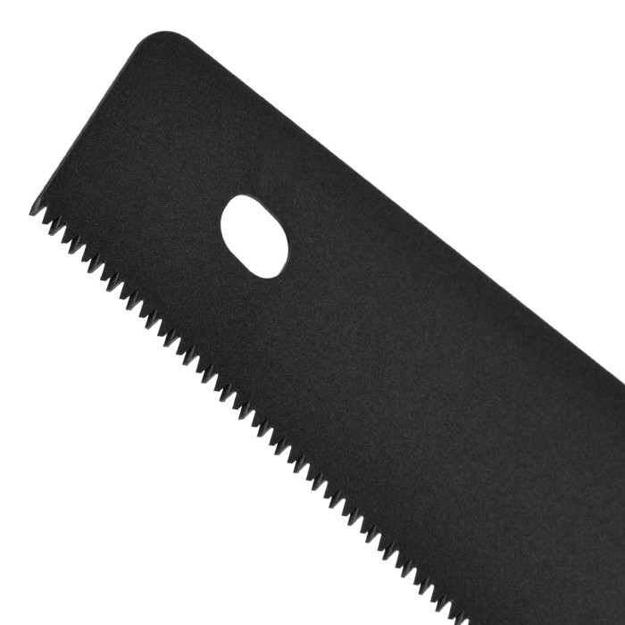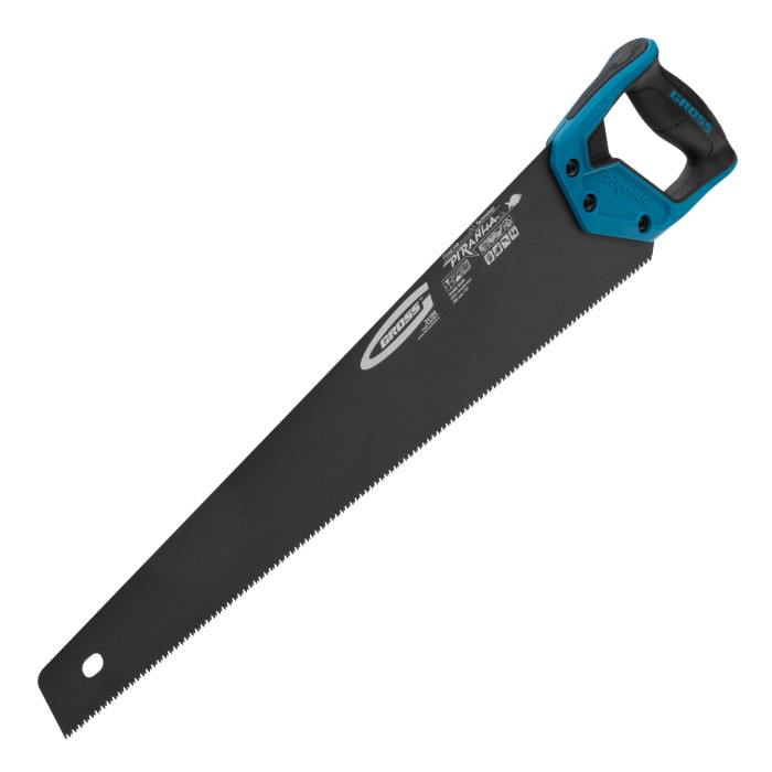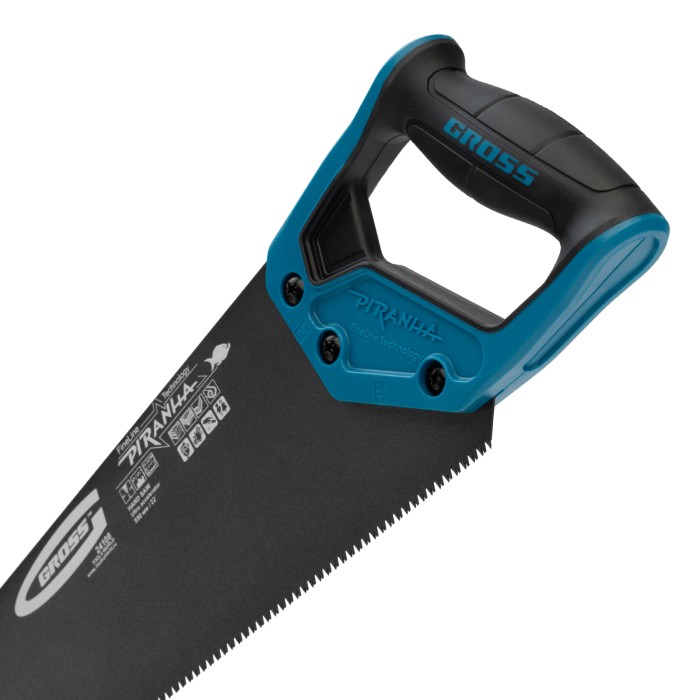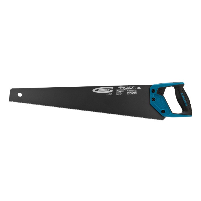 Ножовка по дереву Gross PIRANHA 24108 с полотном длиной 550 мм, калеными зубьями с 3D-заточкой и шагом 11-12 TPI, с тефлоновым покрытием полотна и 2-компонентной рукояткой, используется для продольного и поперечного распиливания древесины различных пород, МДФ, ДСП, ДВП, ламината, а также пенополистирола, полиуретана и других синтетических материалов. Рабочая часть состоит из мелких зубьев с шагом 2-2,3 мм, что позволяет получить ровный и чистый рез. Трехгранная заточка зубьев увеличивает производительность инструмента без потери качества распиловки. Ножовка предназначена для столярных работ.ПреимуществаНадежность — полотно изготовлено из японской пружинной стали SK-5, а рукоятка — из ударопрочного ABS-пластика.Эффективная работа — зубья прошли закалку токами высокой частоты, поэтому рабочая кромка долго сохраняет режущие свойства.Прочность — основание зубьев не закалено на максимум, что снижает вероятность их слома при пилении твердых материалов или попадании на металлический предмет.Долговечность — на поверхность полотна нанесено тефлоновое покрытие, защищающее инструмент от коррозии и увеличивающее срок его службы.Легкий рез — тефлоновый слой улучшает скольжение полотна, что упрощает распиловку.Комфортное использование — эргономичная двухкомпонентная рукоятка с рельефным дизайном удобно лежит в руке, снижая усталость во время длительной работы.Гарантированно высокое качество — ножовка изготовлена в Тайване по классической технологии.