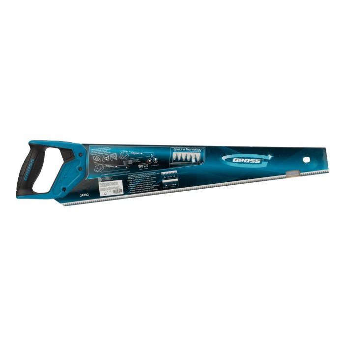 Ножовка по дереву Gross PIRANHA 24102 с полотном длиной 550 мм, калеными зубьями с 3D-заточкой и шагом 7-8 TPI, с 2-компонентной рукояткой, используется для распиливания древесины, МДФ, ДСП, ДВП, ламината, а также пенополистирола, полиуретана и других пластических материалов. Подходит для продольного и поперечного пиления. Зубья имеют универсальный шаг 7-8 TPI, поэтому ножовка подходит для решения широкого спектра задач. Трехгранная заточка зубьев обеспечивает максимальную производительность и высокое качество пиления. Ножовка предназначена для столярных и плотницких работ, пригодится во время ремонта и будет полезна в быту.ПреимуществаНадежность — полотно изготовлено из высококачественной японской стали SK-5, а рукоятка — из ударопрочного ABS-пластика.Эффективная работа — зубья, закаленные токами высокой частоты, долго держат заточку.Прочность — закалка зубьев на 2/3 высоты уменьшает вероятность их слома при обработке древесины твердых пород.Коррозионная стойкость — на полотно нанесено защитное полимерное покрытие.Комфорт во время работы — благодаря эргономичной форме и рифленой поверхности рукоятка удобно ложится в руку и не выскальзывает из ладони.Гарантированное качество — инструмент изготовлен на тайваньском заводе с соблюдением всех технологических требований.