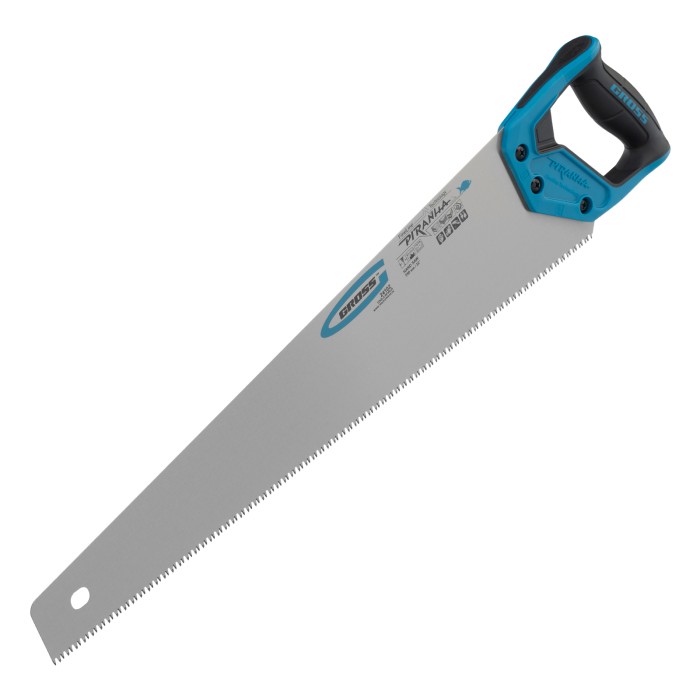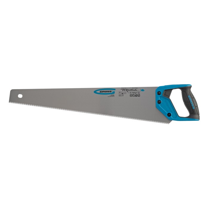 Ножовка по дереву Gross PIRANHA 24102 с полотном длиной 550 мм, калеными зубьями с 3D-заточкой и шагом 7-8 TPI, с 2-компонентной рукояткой, используется для распиливания древесины, МДФ, ДСП, ДВП, ламината, а также пенопо...