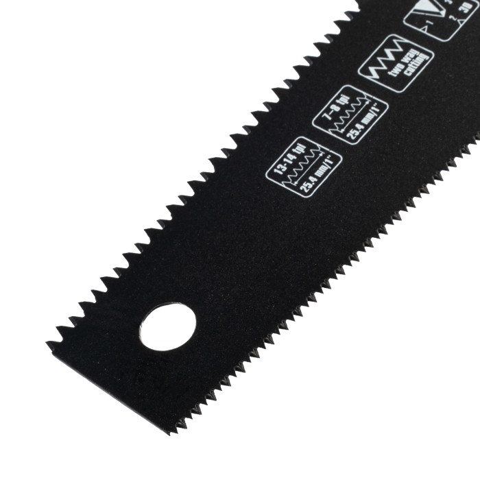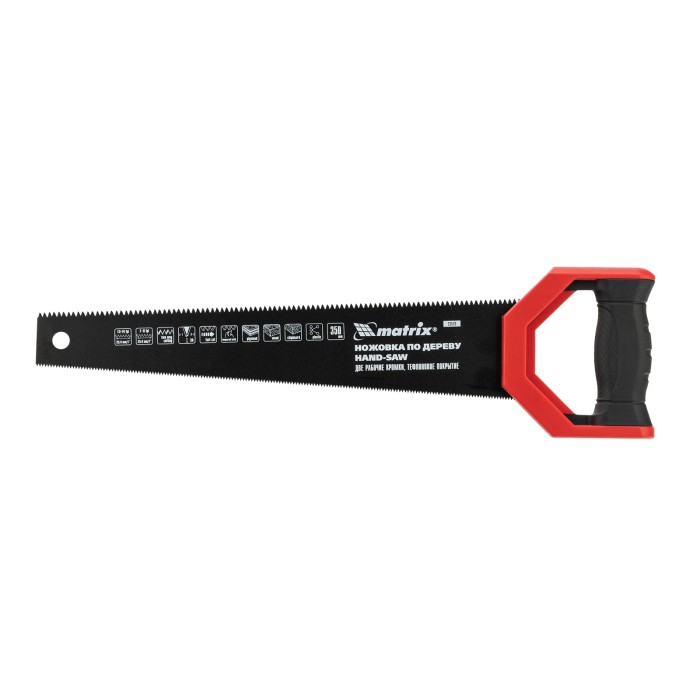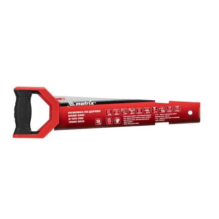 Ножовка по дереву Matrix UNIVERSAL 23570 с полотном длиной 350 мм и закаленными зубьями c заточкой 3D и 2D имеет две рабочие кромки с шагом зубьев 13-14 TPI и 7-8 TPI. Может применяться для выполнения столярных и плотницких работ разной степени точности. Мелкие зубья с 2D-заточкой обеспечивают ровный и точный рез в направлении от себя и к себе. Режущая кромка с шагом зубьев 7-8 TPI и с 3D-заточкой используется для быстрой и чистой распиловки. Ножовкой можно пилить древесину, фанеру, ДСП.ПреимуществаПрочность — полотно из пружинной стали 65Mn выдерживает повышенные нагрузки.Высокий ресурс — зубья ножовки прошли закалку до необходимой твердости.Защита от коррозии — поверхность полотна имеет тефлоновое покрытие.Легкий рез — тефлоновый слой облегчает скольжения полотна для повышения скорости распиловки.Комфортная работа — двухкомпонентная рукоятка с рифлением не выскальзывает из ладони.Надежность — ножовка изготовлена на японском оборудовании под строгим технологическим контролем.