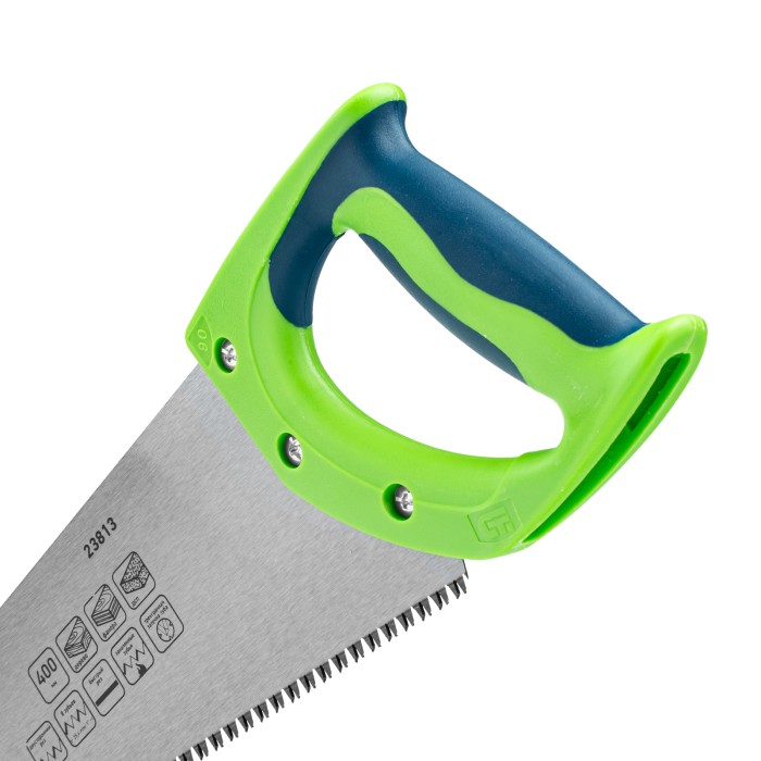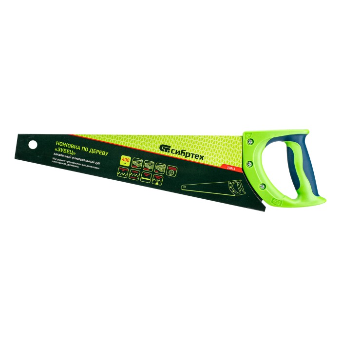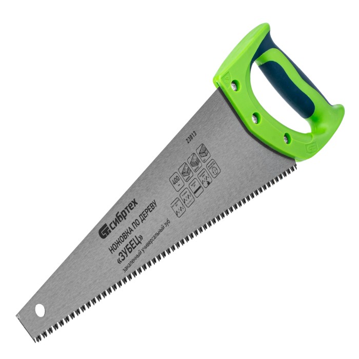 Ножовка Сибртех по дереву «Зубец» 23813 с полотном длиной 400 мм, с калеными зубьями с 3D-заточкой и шагом 7-8 TPI, с двухкомпонентной рукояткой, предназначена для продольной и поперечной распиловки древесины, фанеры и ДСП. Инструмент обладает высокой производительностью благодаря зубьям с универсальным шагом 7-8 TPI и трехгранной заточке. Ножовка используется для выполнения столярных и плотницких работ, будет полезна в быту.ПреимуществаПрочность — полотно из легированной стали 65Mn выдерживает значительные нагрузки.Высокий ресурс — зубья прошли закалку до необходимой твердости.Антикоррозийная защита — поверхность полотна покрыта лаком.Надежная конструкция — рукоятка из ударопрочного ABS-пластика прикреплена к полотну 3 винтами.Комфортная работа — двухкомпонентная рукоятка удобно ложится в руку.