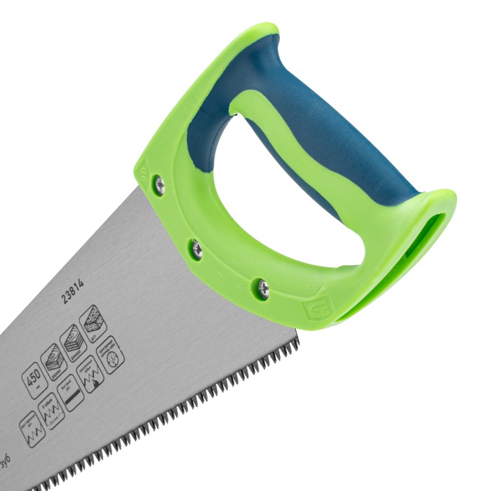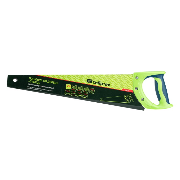 Ножовка Сибртех по дереву «Зубец» 23814 с полотном длиной 450 мм, с калеными зубьями с 3D-заточкой и шагом 7-8 TPI, с двухкомпонентной рукояткой, предназначена для продольной и поперечной распиловки древесины, фанеры и ДСП. Инструмент обладает высокой производительностью благодаря зубьям с универсальным шагом 7-8 TPI и трехгранной заточке. Ножовка используется для выполнения столярных и плотницких работ, будет полезна в быту.ПреимуществаПрочность — полотно из легированной стали 65Mn выдерживает значительные нагрузки.Высокий ресурс — зубья прошли закалку до необходимой твердости.Антикоррозийная защита — поверхность полотна покрыта лаком.Надежная конструкция — рукоятка из ударопрочного ABS-пластика прикреплена к полотну 3 винтами.Комфортная работа — двухкомпонентная рукоятка удобно ложится в руку.